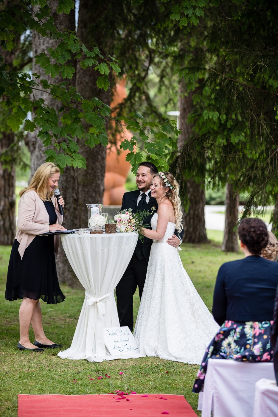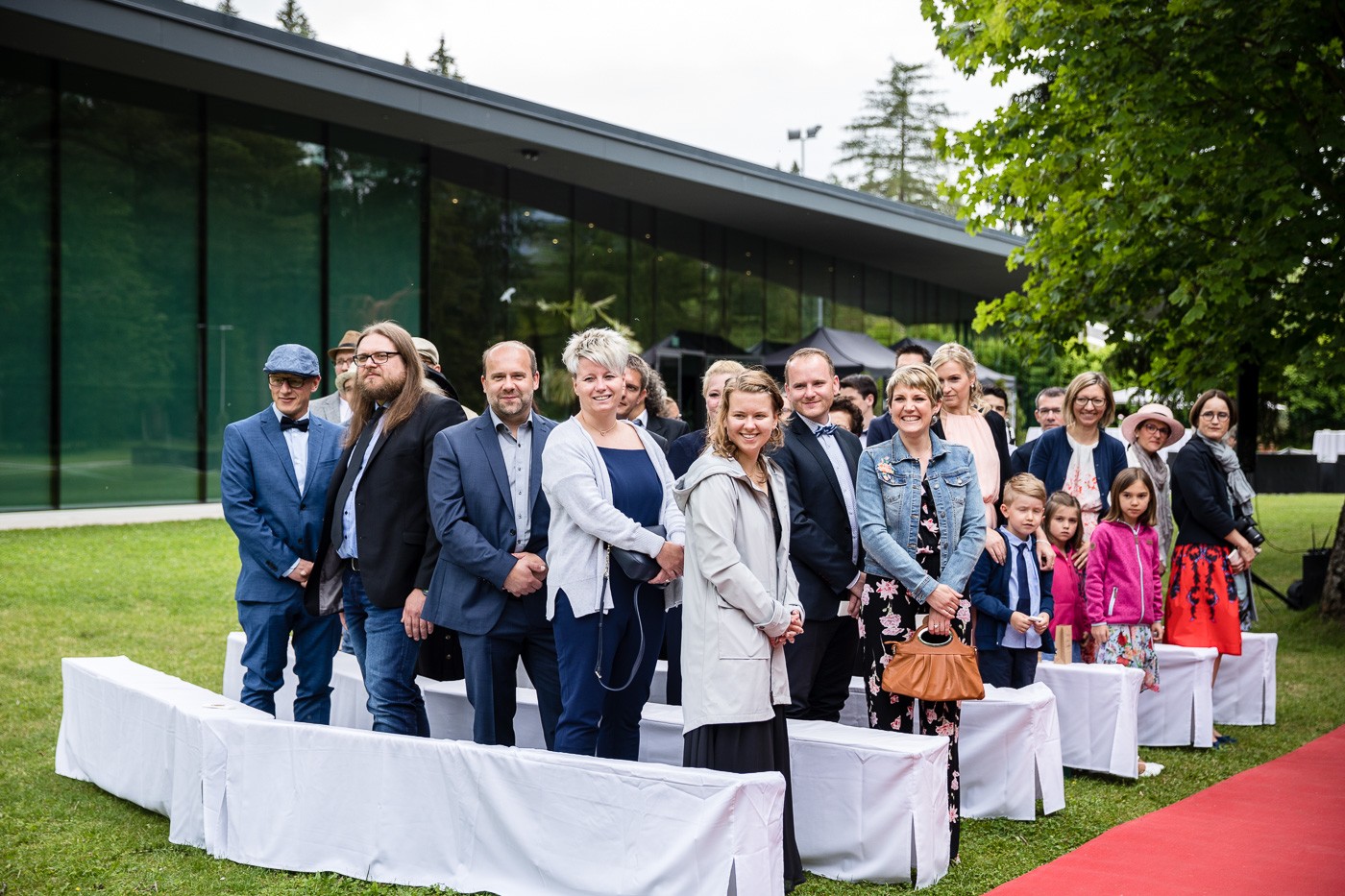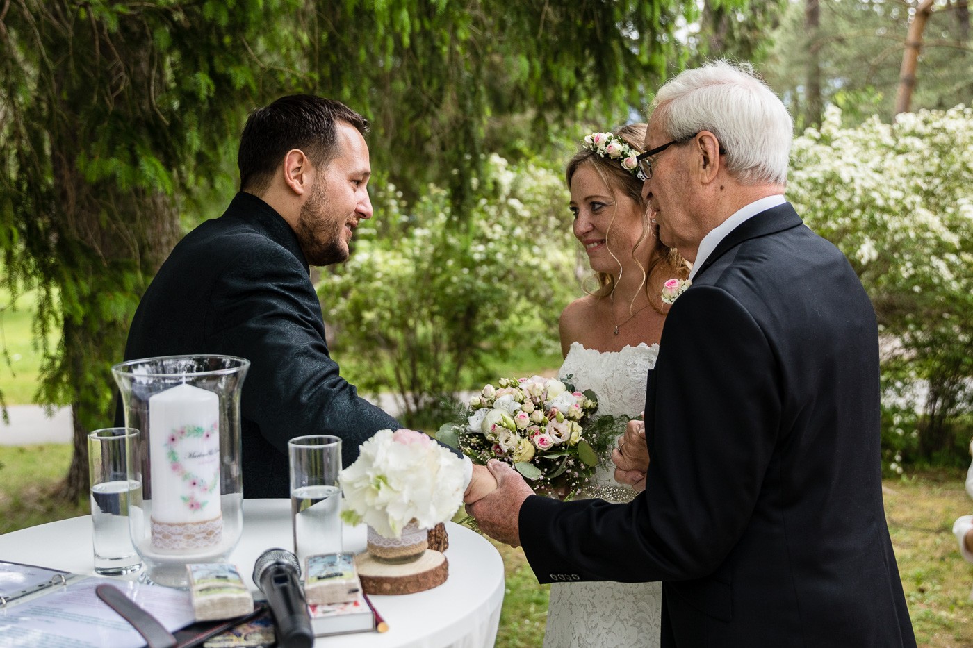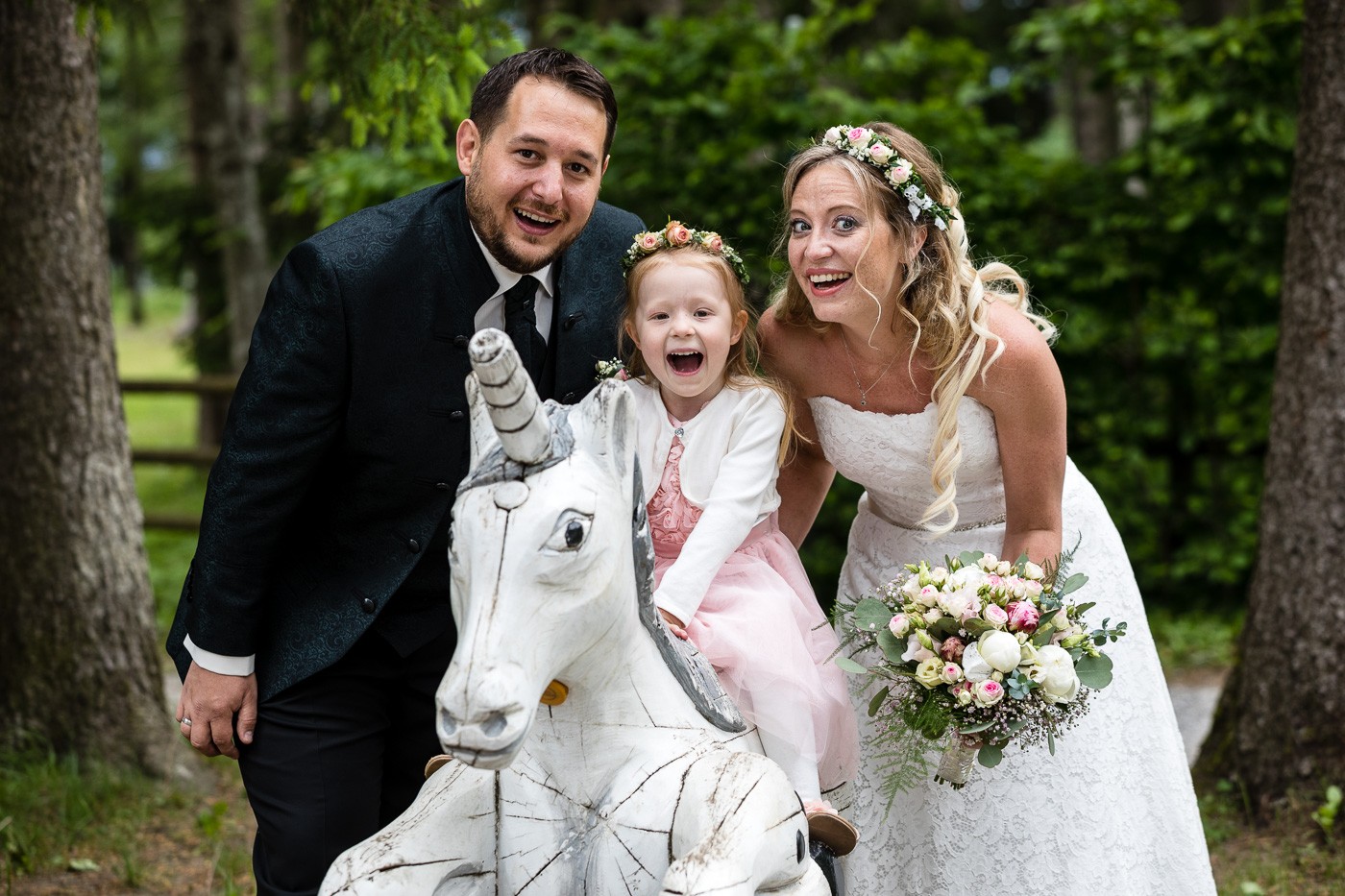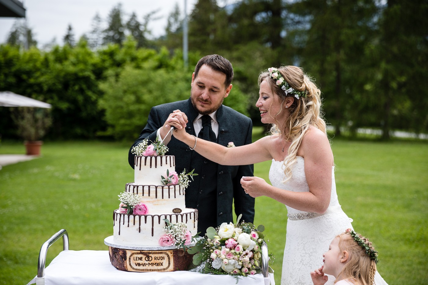 Wenn ich an Marlene und Rudis Hochzeitstag im Congress Igls denke, dann fallen mir sofort die vielen lustigen und emotionalen Momente ein, die ihren Tag unvergesslich machten. Gemeinsam mit Rudi wartete ich auf seine Marlene, die zusammen mit Tochter Nora in den Park gebracht wurde. Die Aufregung und Vorfreude auf ihr erstes Zusammentreffen im Hochzeitsoutfit war kaum zu übersehen. Rudi war vom Anblick seiner Zukünftigen überwältigt und beinahe sprachlos. Zusammen waren sie unübersehbar das perfekte Dreamteam. Nach diesem emotionalen „First-look“ starteten wir mit der Portraitserie, wobei ihre süße Tochter für eine äußerst heitere Stimmung sorgte. Im Anschluß zu den Brautpaarportraits trafen die Hochzeitsgäste ein. Nach einem kurzen Empfang startete die freie Trauungszeremonie mitten im Park, die von der Hochzeitsrednerin Birgit Bruckmüller wieder mal wunderbar gestaltet wurde. Bei der perfekt auf die Geschichte des Brautpaares zugeschnittene Rede, waren Freudentränen und auch ein paar Lachtränchen sicher. Auch die Mitgestaltung der Trauung von einigen Gästen machten diesen Moment zum Höhepunkt des Tages. Unter viel Jubel zog das freudestrahlende Brautpaar Richtung Sektempfang aus, wo sie zunächst die vielen, persönlichen Glückwünsche ihrer Liebsten entgegen nahmen. Danach wurde feierlich die Hochzeitstorte angeschnitten und im modernen Saal des Congress Igls ausgelassen weiter gefeiert.