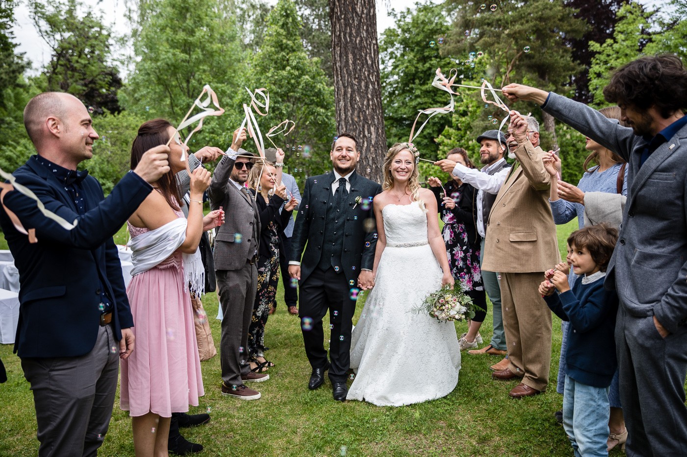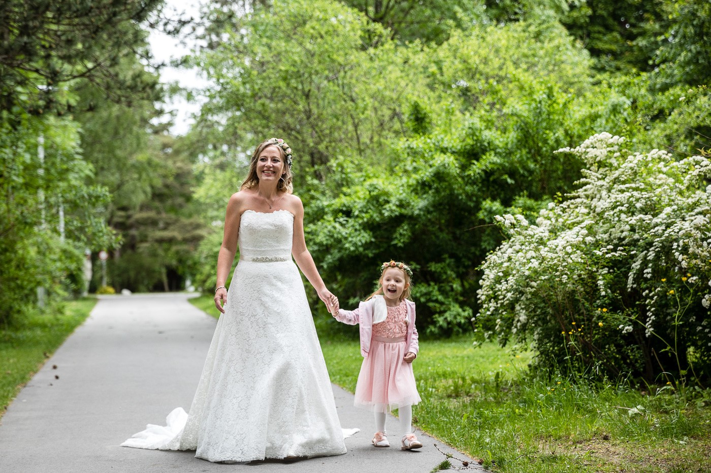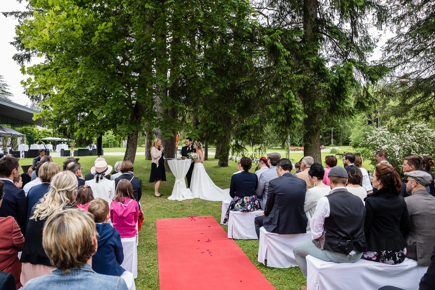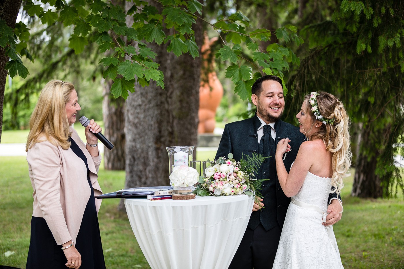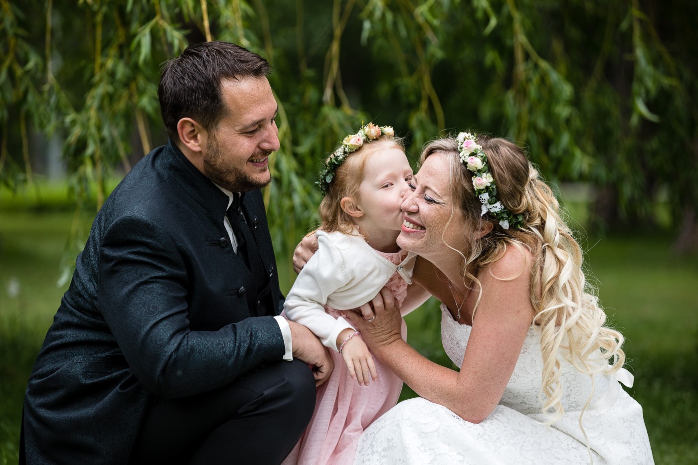 Wenn ich an Marlene und Rudis Hochzeitstag im Congress Igls denke, dann fallen mir sofort die vielen lustigen und emotionalen Momente ein, die ihren Tag unvergesslich machten. Gemeinsam mit Rudi wartete ich auf seine Marlene, die zusammen mit Tochter Nora in den Park gebracht wurde. Die Aufregung und Vorfreude auf ihr erstes Zusammentreffen im Hochzeitsoutfit war kaum zu übersehen. Rudi war vom Anblick seiner Zukünftigen überwältigt und beinahe sprachlos. Zusammen waren sie unübersehbar das perfekte Dreamteam. Nach diesem emotionalen „First-look“ starteten wir mit der Portraitserie, wobei ihre süße Tochter für eine äußerst heitere Stimmung sorgte. Im Anschluß zu den Brautpaarportraits trafen die Hochzeitsgäste ein. Nach einem kurzen Empfang startete die freie Trauungszeremonie mitten im Park, die von der Hochzeitsrednerin Birgit Bruckmüller wieder mal wunderbar gestaltet wurde. Bei der perfekt auf die Geschichte des Brautpaares zugeschnittene Rede, waren Freudentränen und auch ein paar Lachtränchen sicher. Auch die Mitgestaltung der Trauung von einigen Gästen machten diesen Moment zum Höhepunkt des Tages. Unter viel Jubel zog das freudestrahlende Brautpaar Richtung Sektempfang aus, wo sie zunächst die vielen, persönlichen Glückwünsche ihrer Liebsten entgegen nahmen. Danach wurde feierlich die Hochzeitstorte angeschnitten und im modernen Saal des Congress Igls ausgelassen weiter gefeiert.