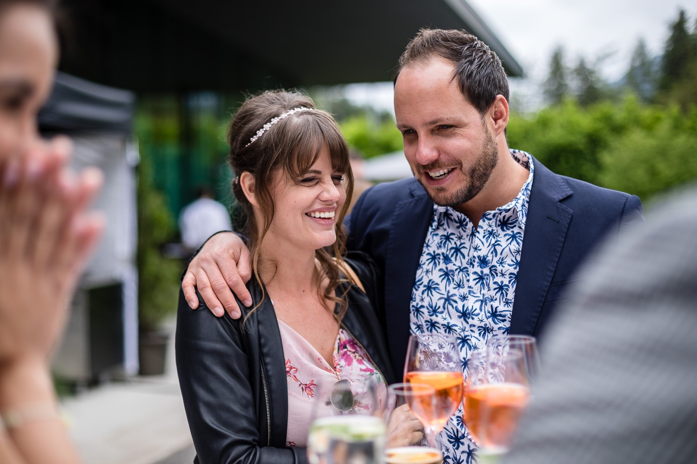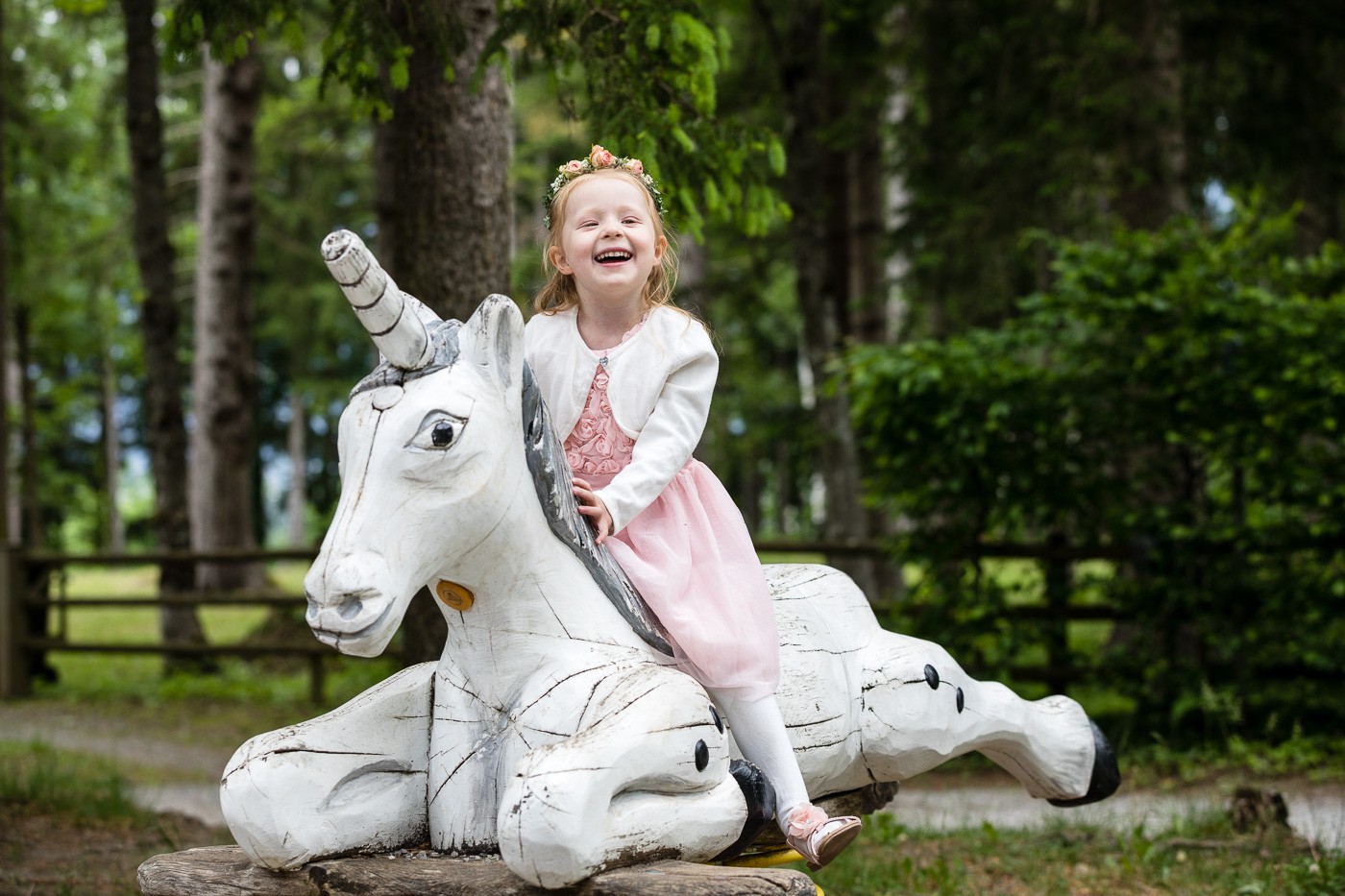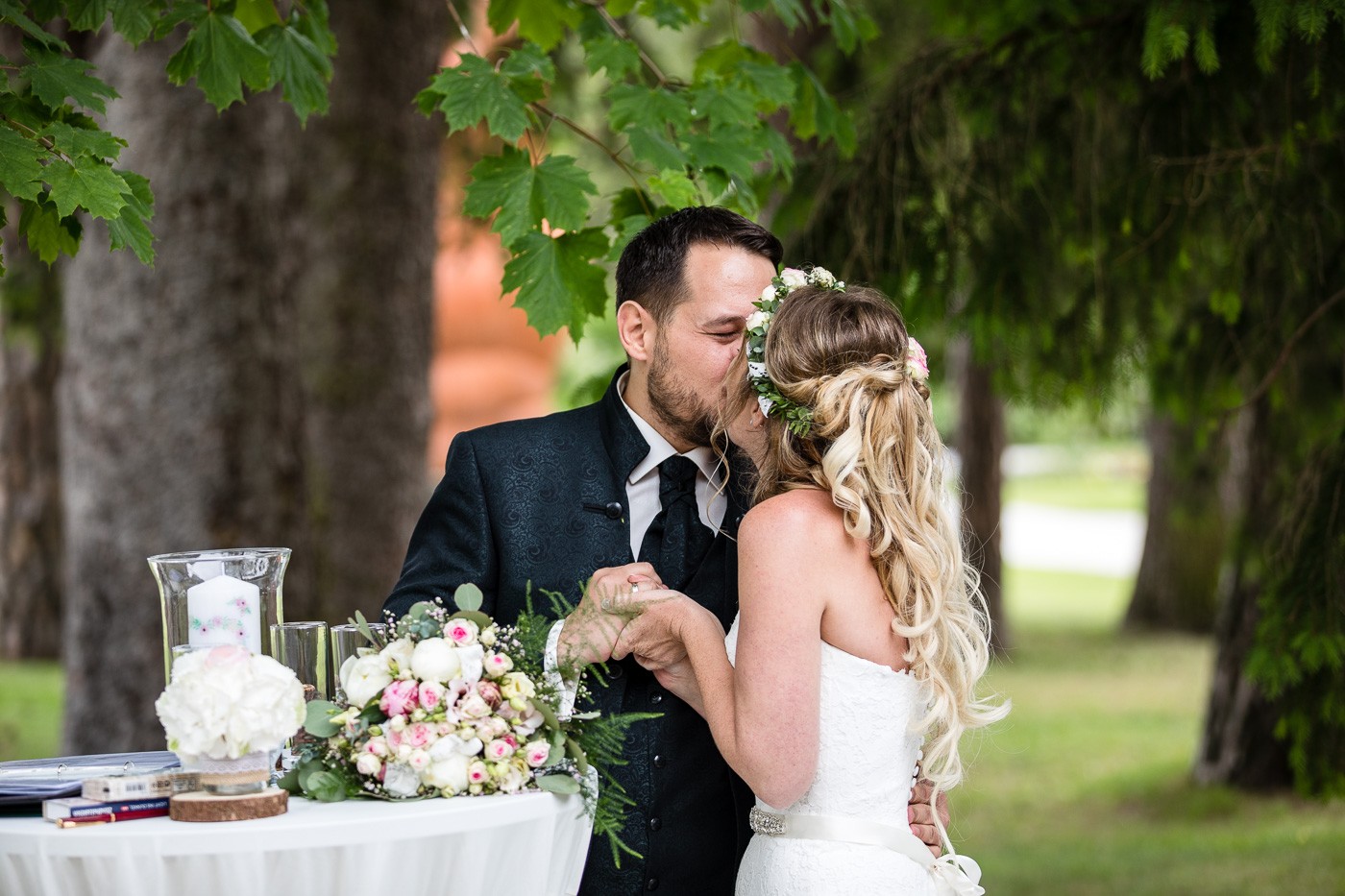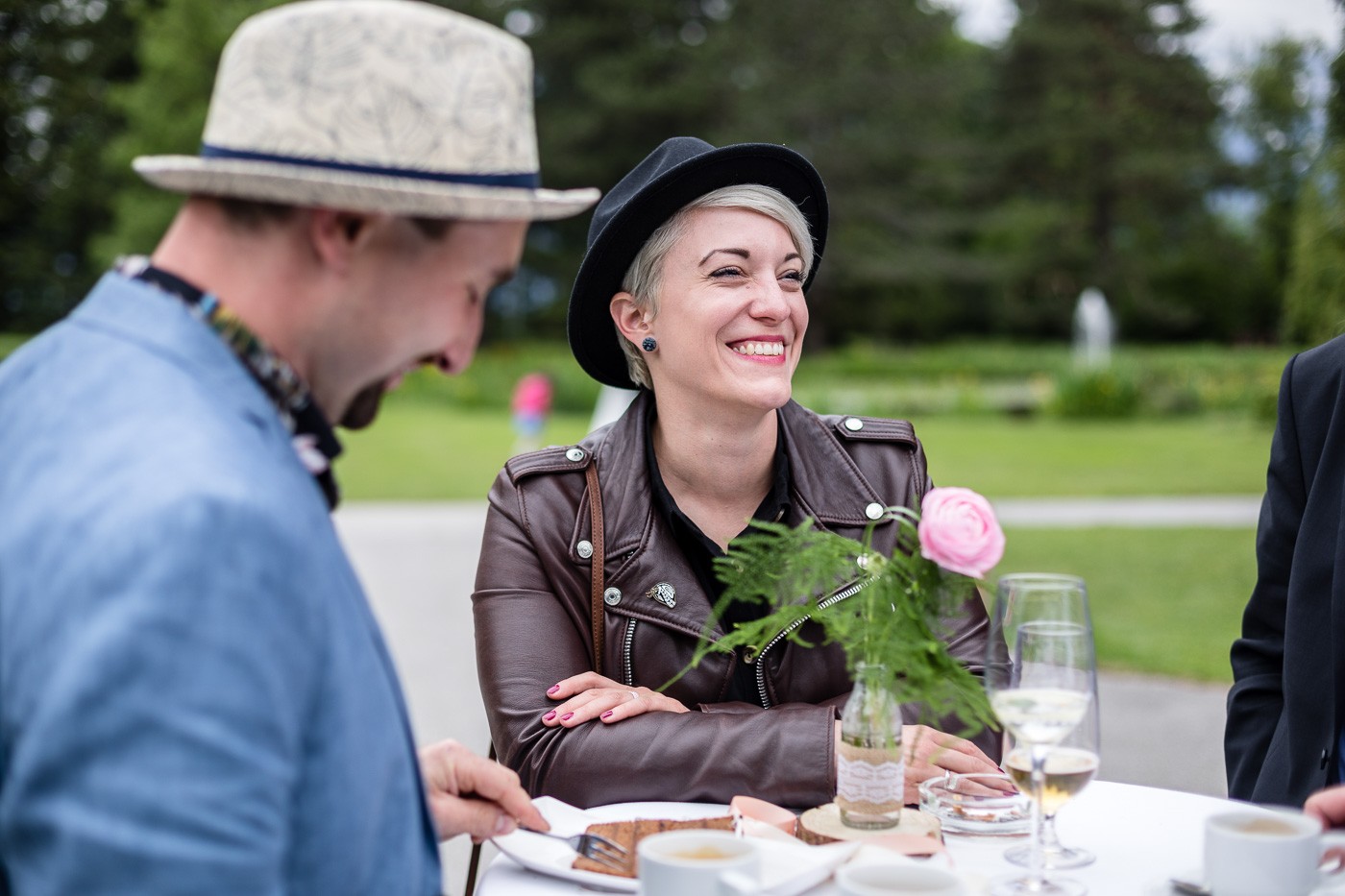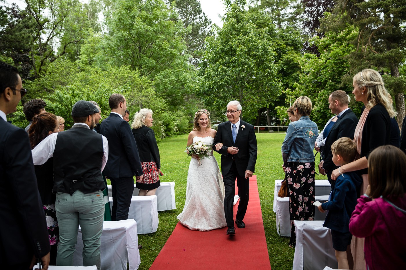 Wenn ich an Marlene und Rudis Hochzeitstag im Congress Igls denke, dann fallen mir sofort die vielen lustigen und emotionalen Momente ein, die ihren Tag unvergesslich machten. Gemeinsam mit Rudi wartete ich auf seine Marlene, die zusammen mit Tochter Nora in den Park gebracht wurde. Die Aufregung und Vorfreude auf ihr erstes Zusammentreffen im Hochzeitsoutfit war kaum zu übersehen. Rudi war vom Anblick seiner Zukünftigen überwältigt und beinahe sprachlos. Zusammen waren sie unübersehbar das perfekte Dreamteam. Nach diesem emotionalen „First-look“ starteten wir mit der Portraitserie, wobei ihre süße Tochter für eine äußerst heitere Stimmung sorgte. Im Anschluß zu den Brautpaarportraits trafen die Hochzeitsgäste ein. Nach einem kurzen Empfang startete die freie Trauungszeremonie mitten im Park, die von der Hochzeitsrednerin Birgit Bruckmüller wieder mal wunderbar gestaltet wurde. Bei der perfekt auf die Geschichte des Brautpaares zugeschnittene Rede, waren Freudentränen und auch ein paar Lachtränchen sicher. Auch die Mitgestaltung der Trauung von einigen Gästen machten diesen Moment zum Höhepunkt des Tages. Unter viel Jubel zog das freudestrahlende Brautpaar Richtung Sektempfang aus, wo sie zunächst die vielen, persönlichen Glückwünsche ihrer Liebsten entgegen nahmen. Danach wurde feierlich die Hochzeitstorte angeschnitten und im modernen Saal des Congress Igls ausgelassen weiter gefeiert.