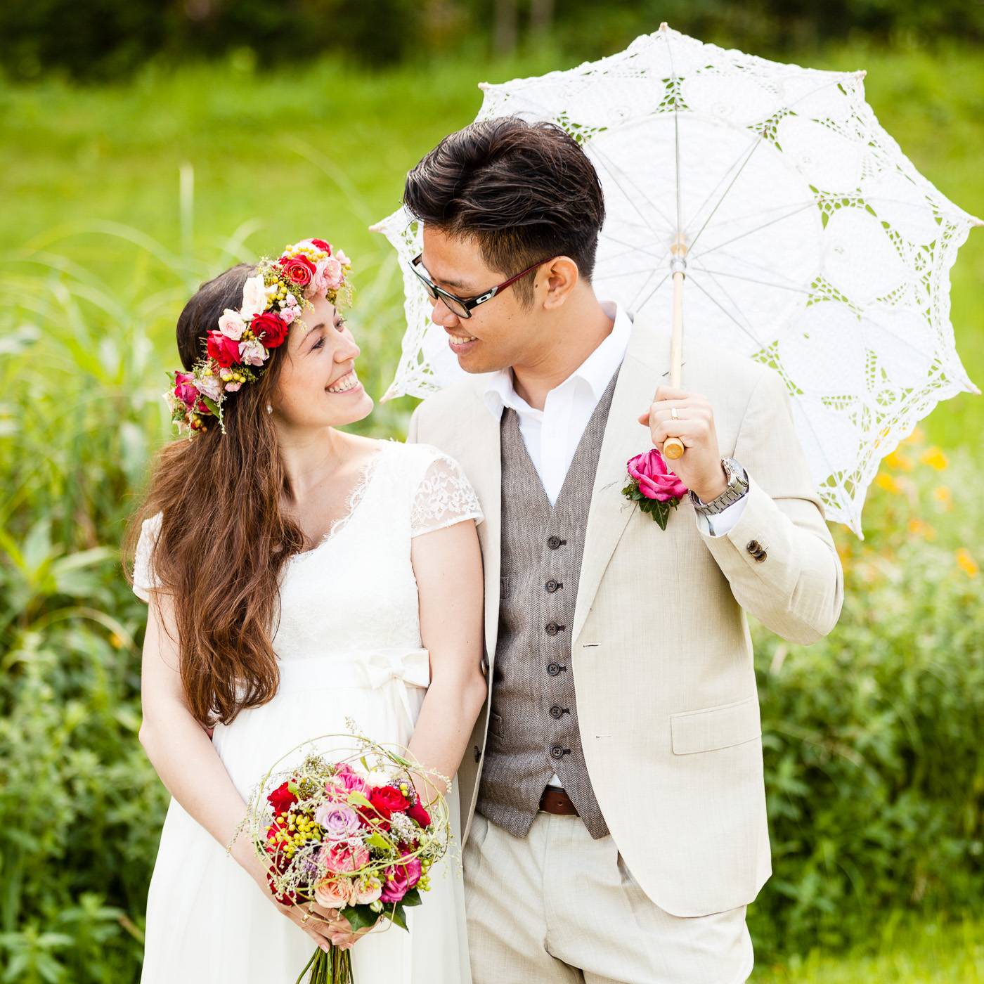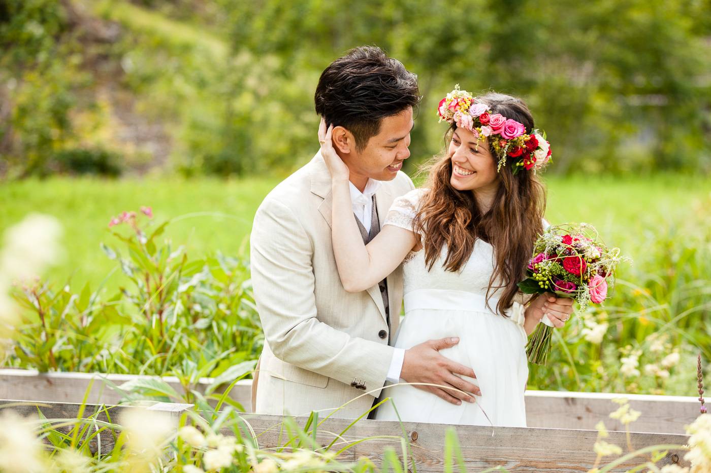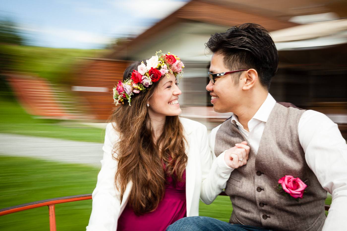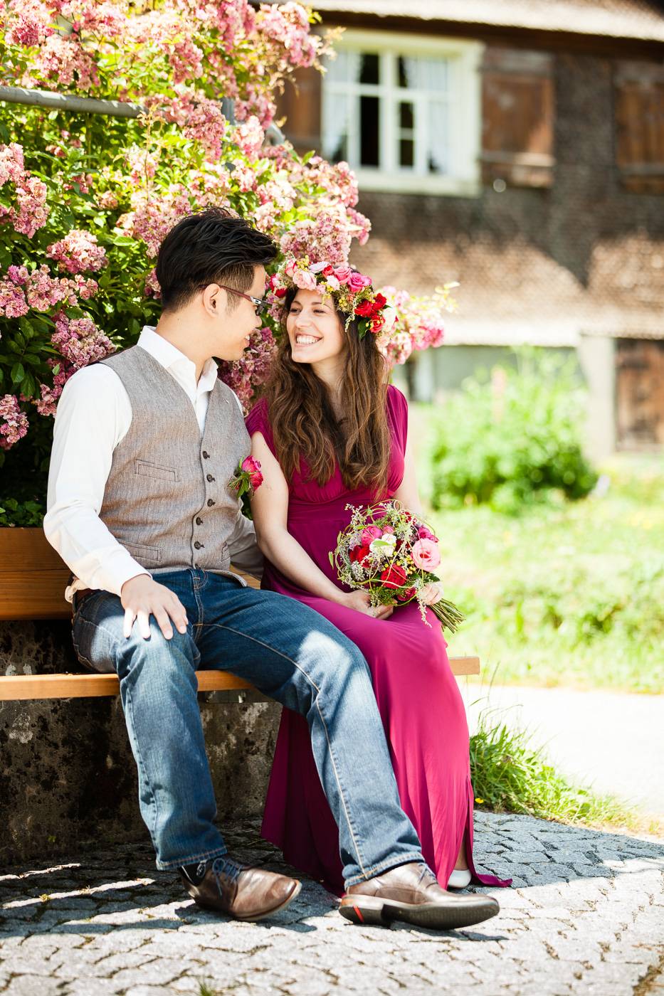 Anfang 2016 erhielt ich eine Hochzeitsanfrage aus Tokio. Elisa, die dort lebende Vorarlbergerin, wollte zusammen mit ihrem Mann Hoang ihre Hochzeit auf österreichische Art und Weise feiern, nachdem sie bereits in Vietnam getraut wurden. Ich fühlte mich wirklich geehrt, dass die beiden so viel Vertrauen in meine Arbeit hatten, dass sie mich ohne persönliches Kennenlernen übers Internet buchten. Am Vorabend ihrer Hochzeit lernte ich nicht nur das sympathische Paar kennen, sondern machte auch noch einen ausgiebigen Locationcheck rund um Schwarzenberg im idyllischen Bregenzerwald. Der Hochzeitstag war dann einfach wunderschön und perfekt organisiert. Die bunt gemischten und teilweise sehr weit angereisten Gäste feierten mit dem überglücklichen Brautpaar Elisa und Hoang eine wunderschöne und sehr emotionale Hochzeit.