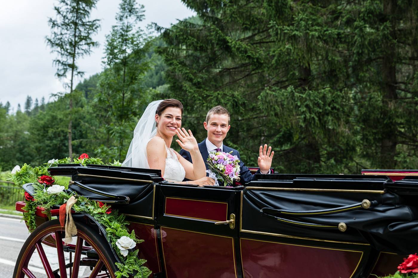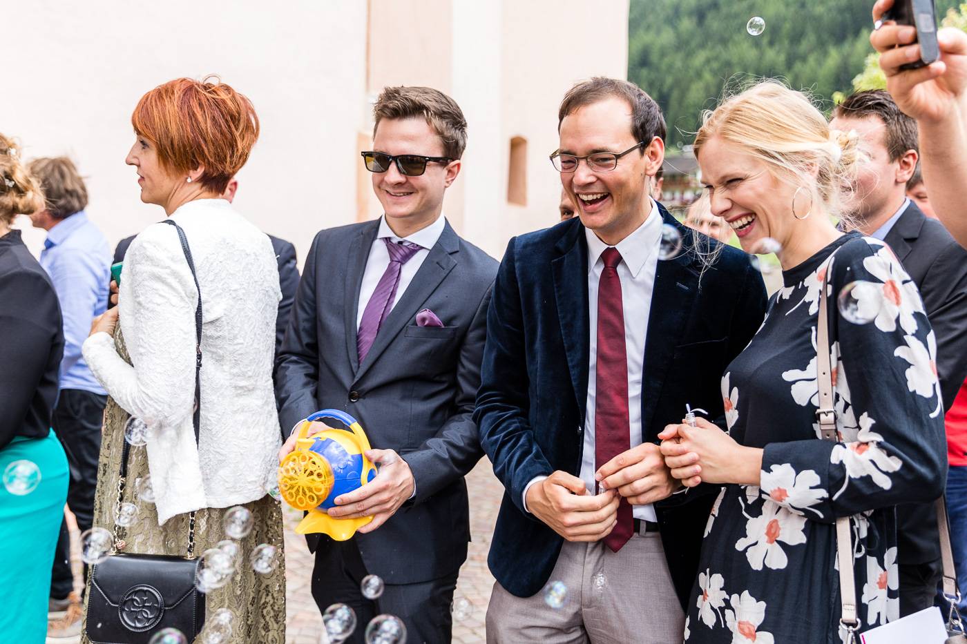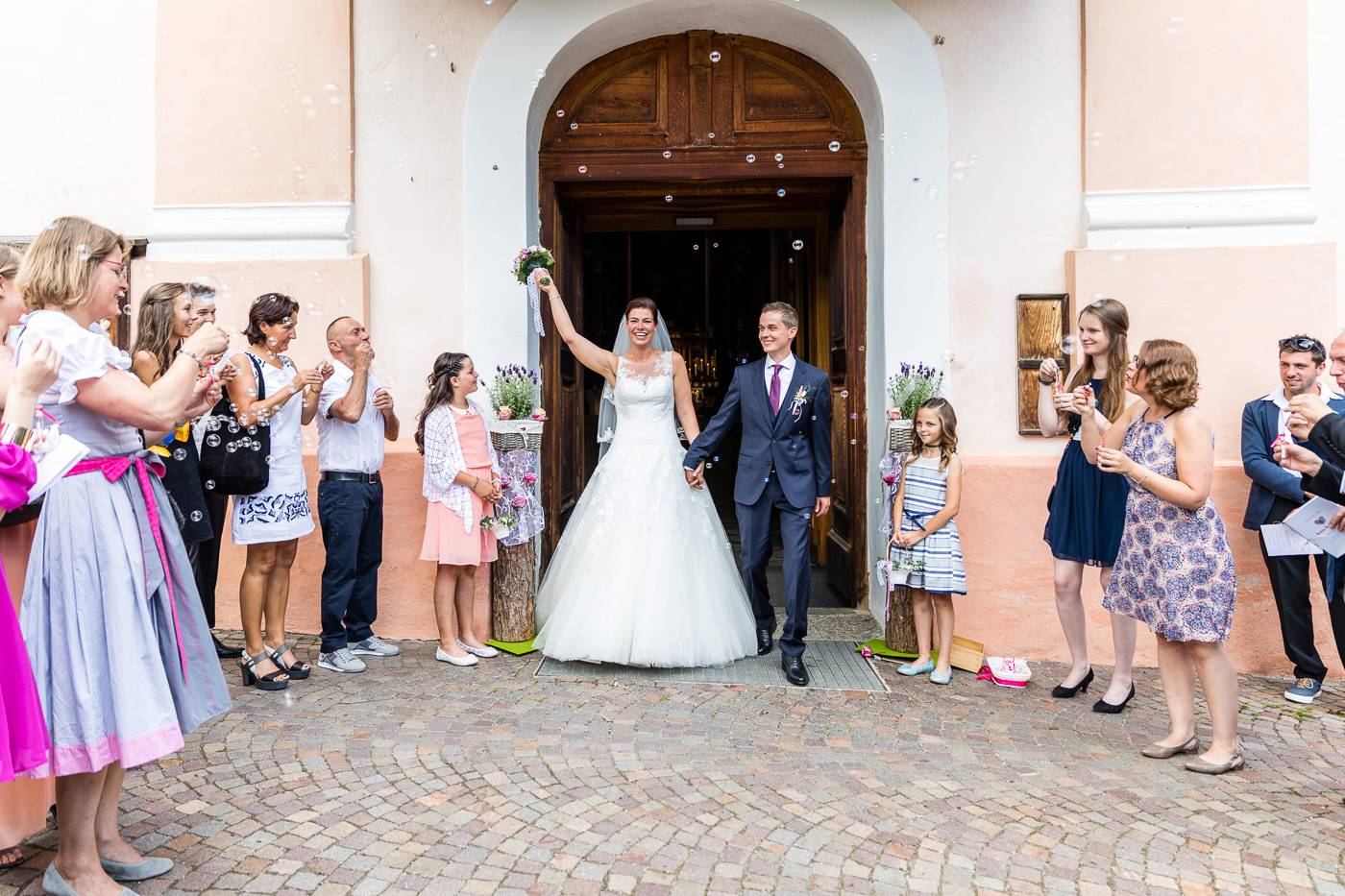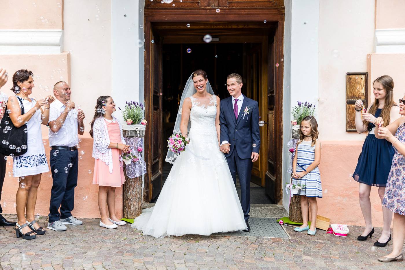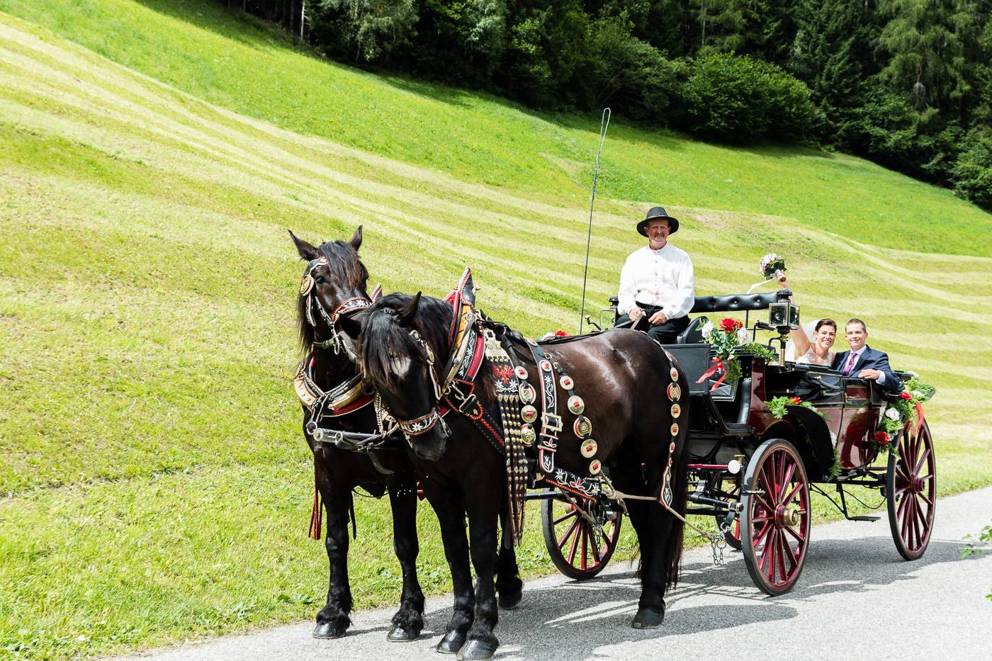 Am Hochzeitstag fand das erste Treffen des Brautpaares auf der Burg Sand in Taufers statt, wo sich die beiden in die Arme fielen. Die Burg bot uns ein schönes und vielfältiges Ambiente für die Hochzeitsportraitserie. Danach ging es direkt in die Kirche nach St. Johann, wo die vielen Gäste mit dem Brautpaar mitzelebrierten und die stimmungsvolle Messe gestalteten. Mit einer Pferdekutsche fuhr das frischverheiratete Paar dann unerwarteterweise zur Pferderanch, wo sich ihre Freunde die perfekte Überraschung ausgedacht hatten. Den Sektempfang genoss die Hochzeitsgesellschaft anschließend im Design-Hotel Feldmilla in Sand. Nach einer weiteren kleinen Portraitserie in Hotel-Umgebung startete die abendliche und sehr fröhliche Hochzeitsfeier. Der Abend wurde von Familienmitgliedern und Freunden mit einfallsreichen, lustigen und auch sehr persönlichen Einlagen und Überraschungen für das Hochzeitspaar gestaltete. Für Teresa und Markus war es, wie sie mir danach berichteten, ihr schönster Tag im Leben.