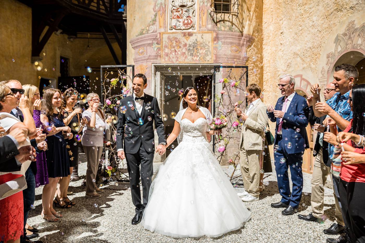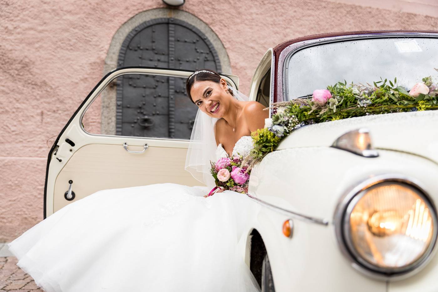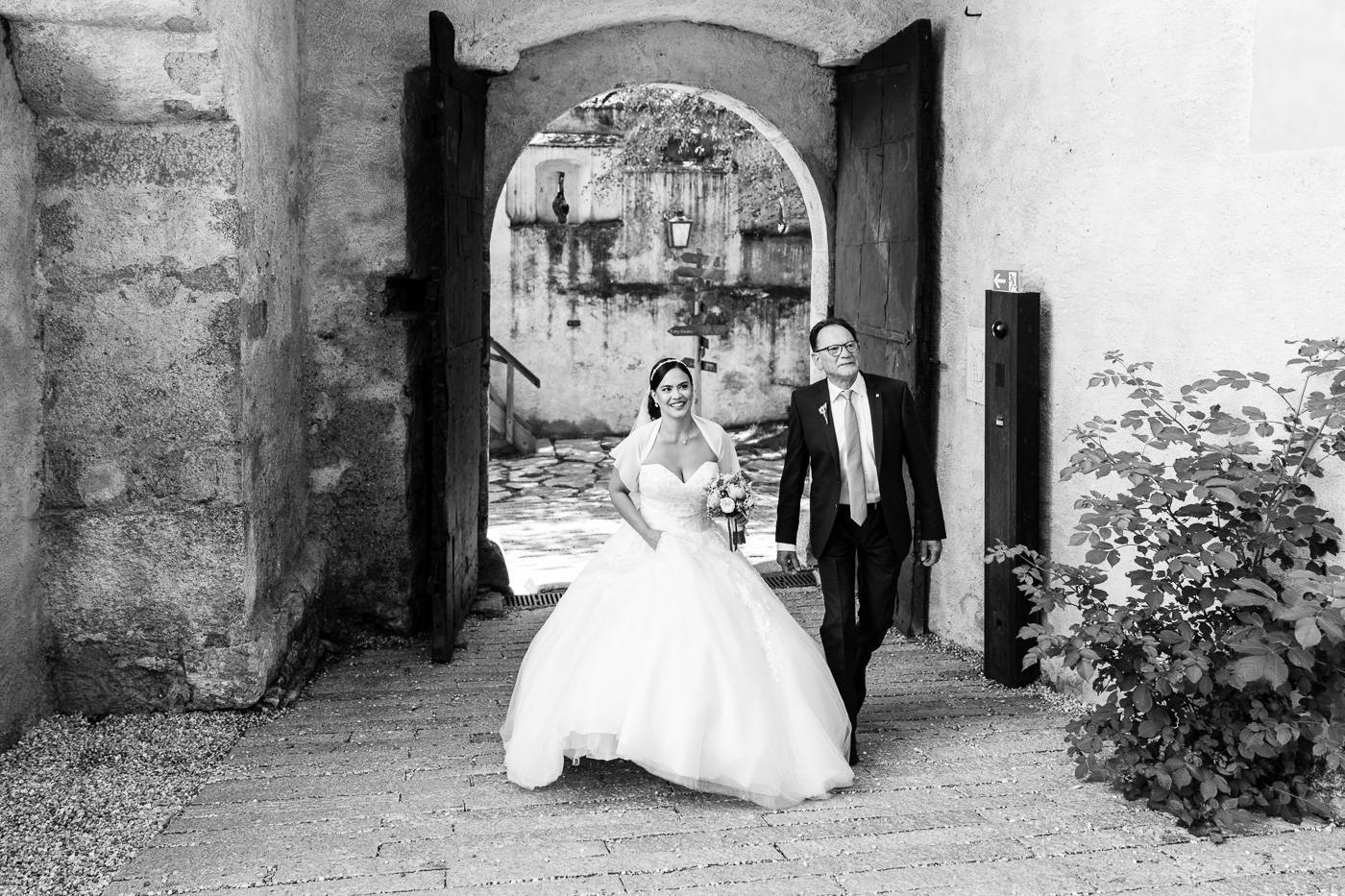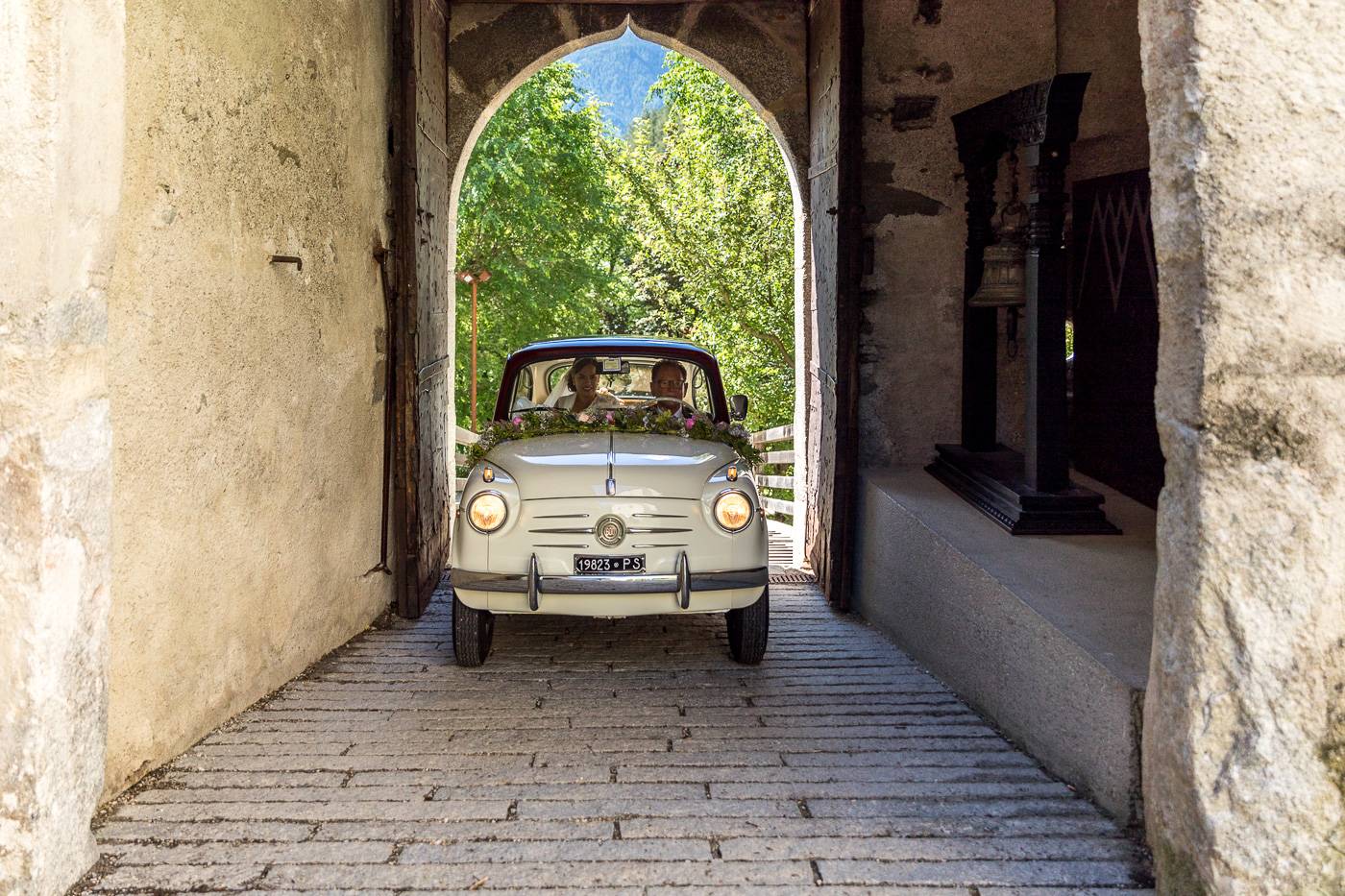 Barbaras und Jochens Hochzeit führte mich ins schöne Südtirol nach Bruneck. Beim gemeinsamen Locationcheck am Vorabend suchten wir nach fotogenen Plätzen rund ums Schloss Bruneck sowie in der Altstadt, war es doch meine erste Hochzeitsbegleitung an diesem schönen Fleckchen. Am Hochzeitstag traf die Braut mit einem 48 Jahre alten Fiat 600er zur Trauung ein, wo sie sich mit ihrem voluminösen und wunderschönen Kleid hineingepfercht hatte. Das erste Zusammentreffen des Brautpaares fand im Innenhof des Schloss Bruneck statt, wo sich die beiden unglaublich anstrahlten. Die standesamtliche Trauung fand in einem schönen Schlosszimmer statt und wurde von den Gästen mitzelebriert. Unter einem Schwall aus Seifenblasen betrat das frischverheiratete Pärchen danach den Burghof, wo bei Sekt und italienischen Köstlichkeiten zunächst mal angestossen und gefeiert wurde. Nach dem Sektempfang starteten wir die Portraitserie, wobei uns das Schloss, das auch das Messner Mountain Museum beherbergt, ein tolles Ambiente bot. Der kurze Regenguss bei den Portraits in der Altstadt danach konnte die Laune der beiden nicht trüben, so sehr genossen sie ihr Glück sich gefunden zu haben.