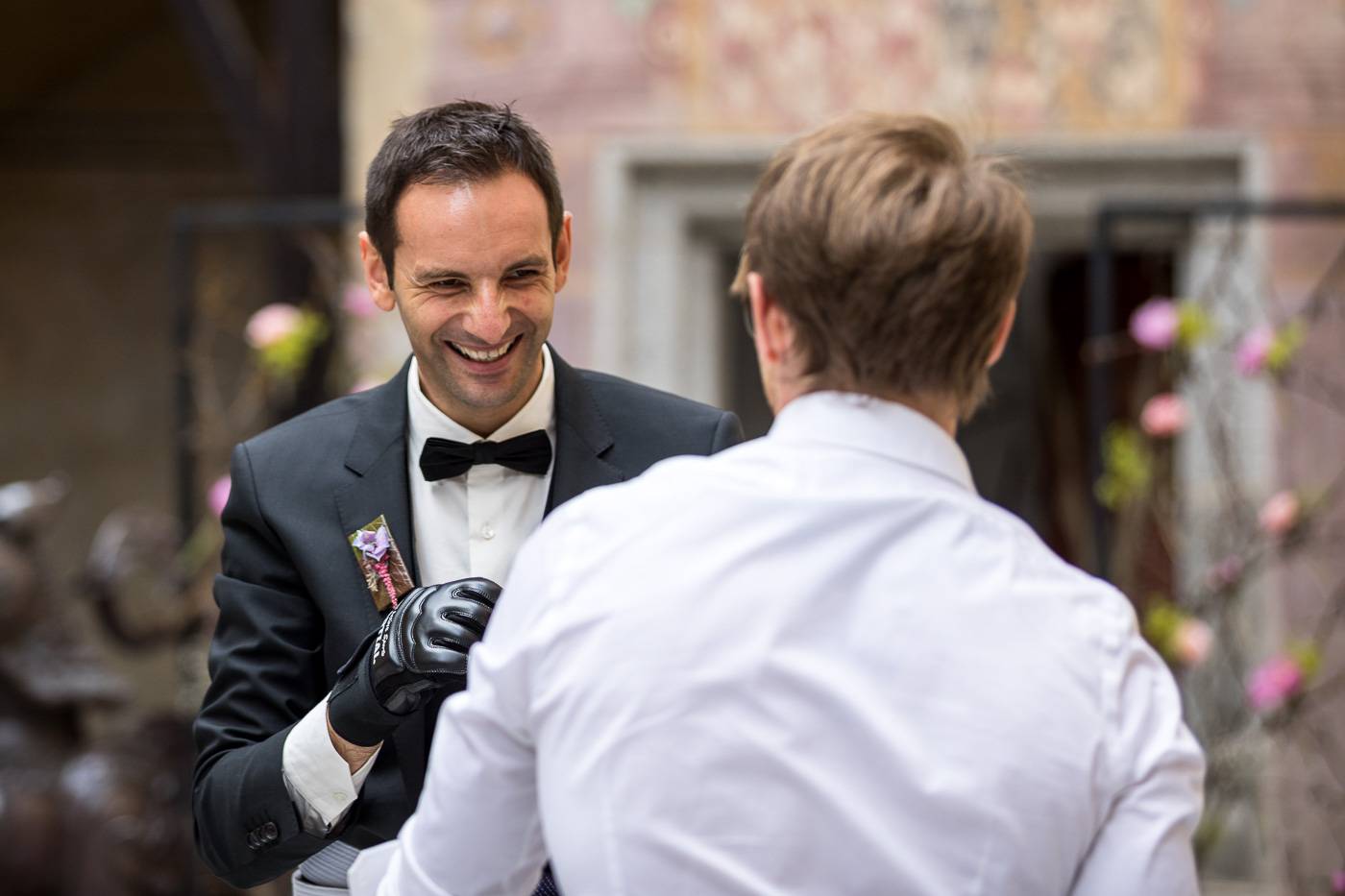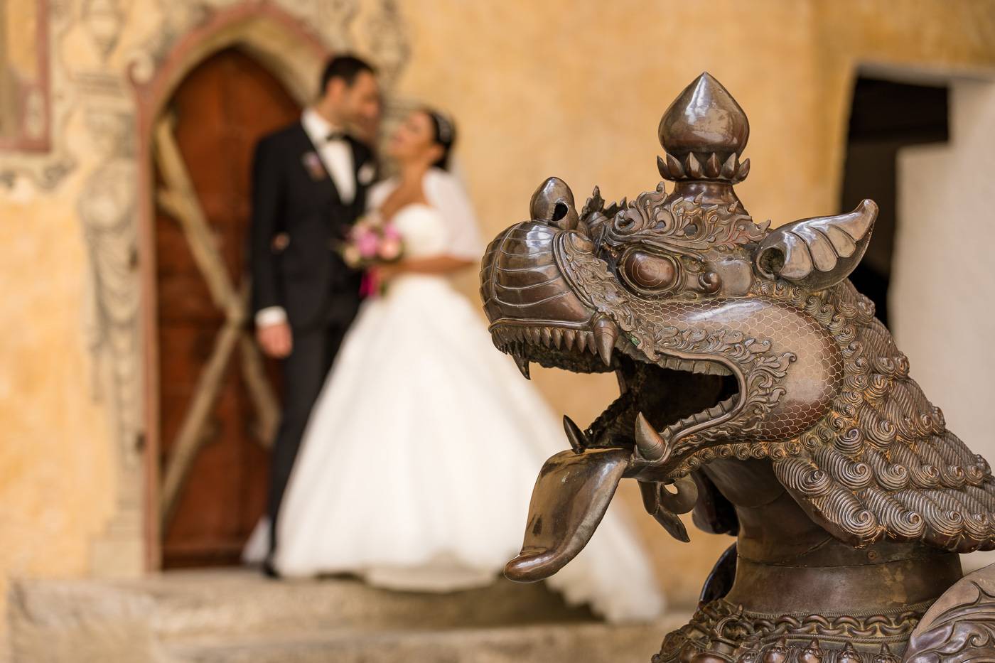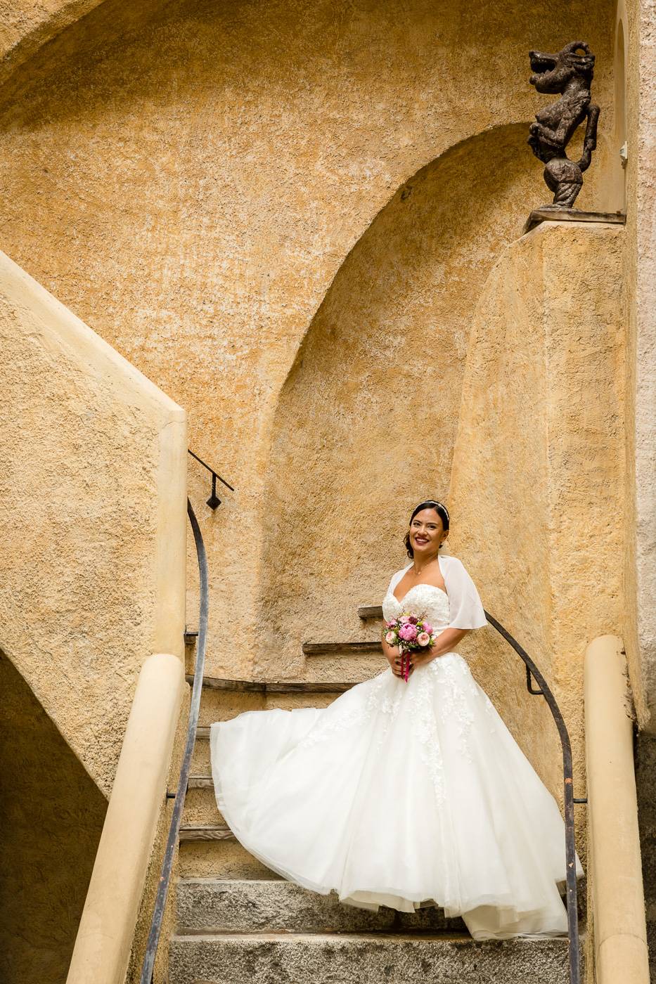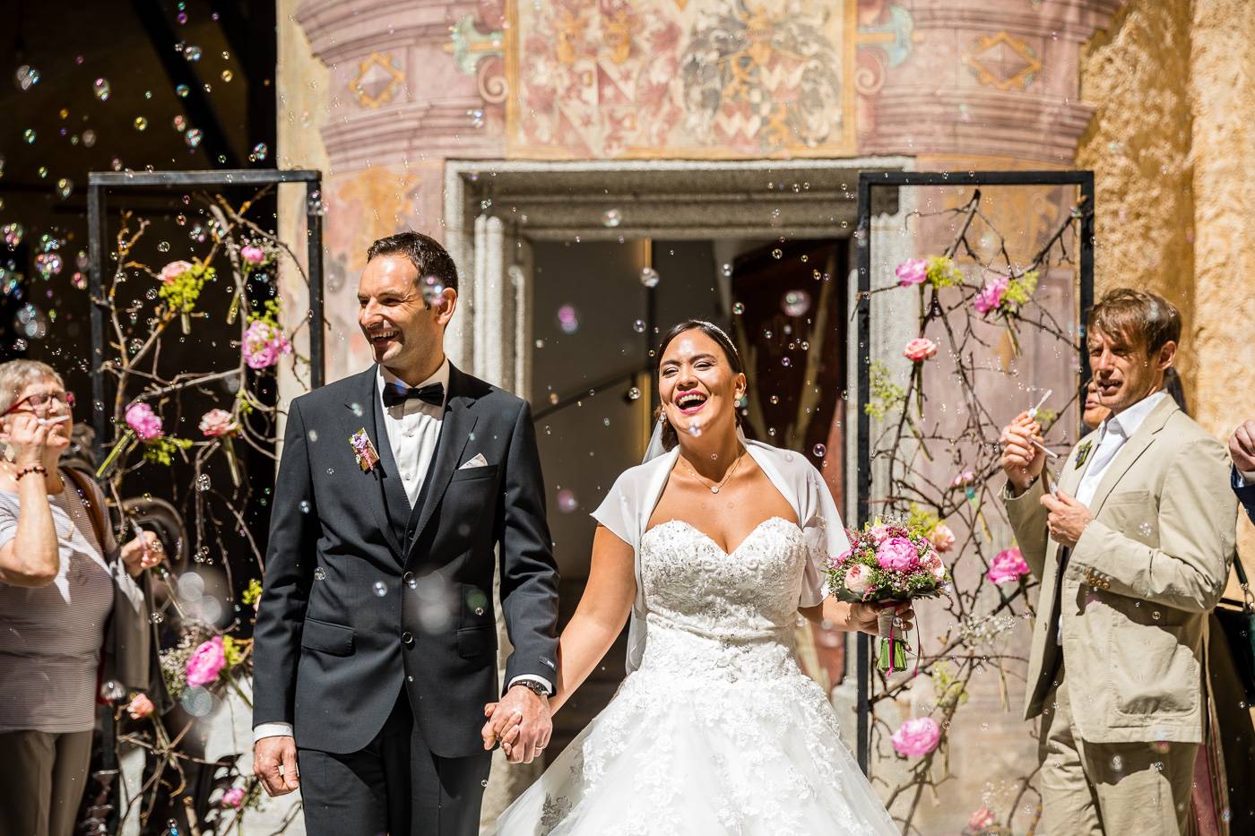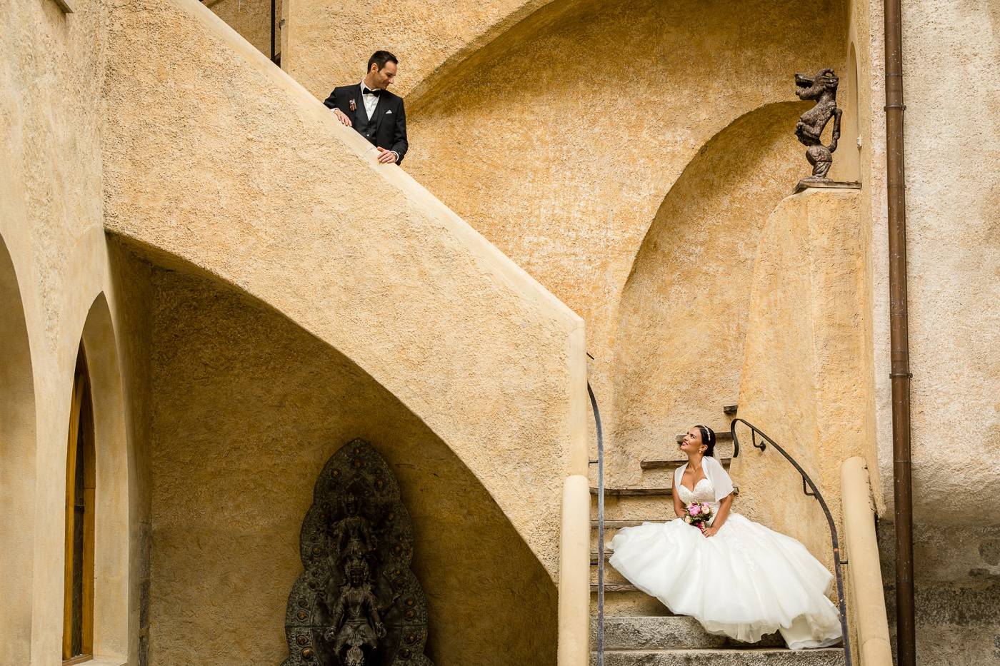 Barbaras und Jochens Hochzeit führte mich ins schöne Südtirol nach Bruneck. Beim gemeinsamen Locationcheck am Vorabend suchten wir nach fotogenen Plätzen rund ums Schloss Bruneck sowie in der Altstadt, war es doch meine erste Hochzeitsbegleitung an diesem schönen Fleckchen. Am Hochzeitstag traf die Braut mit einem 48 Jahre alten Fiat 600er zur Trauung ein, wo sie sich mit ihrem voluminösen und wunderschönen Kleid hineingepfercht hatte. Das erste Zusammentreffen des Brautpaares fand im Innenhof des Schloss Bruneck statt, wo sich die beiden unglaublich anstrahlten. Die standesamtliche Trauung fand in einem schönen Schlosszimmer statt und wurde von den Gästen mitzelebriert. Unter einem Schwall aus Seifenblasen betrat das frischverheiratete Pärchen danach den Burghof, wo bei Sekt und italienischen Köstlichkeiten zunächst mal angestossen und gefeiert wurde. Nach dem Sektempfang starteten wir die Portraitserie, wobei uns das Schloss, das auch das Messner Mountain Museum beherbergt, ein tolles Ambiente bot. Der kurze Regenguss bei den Portraits in der Altstadt danach konnte die Laune der beiden nicht trüben, so sehr genossen sie ihr Glück sich gefunden zu haben.