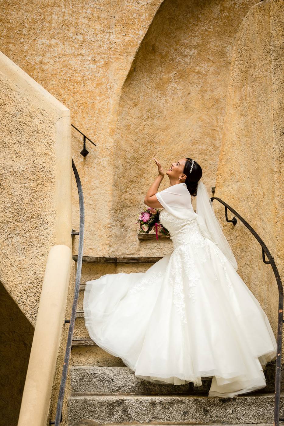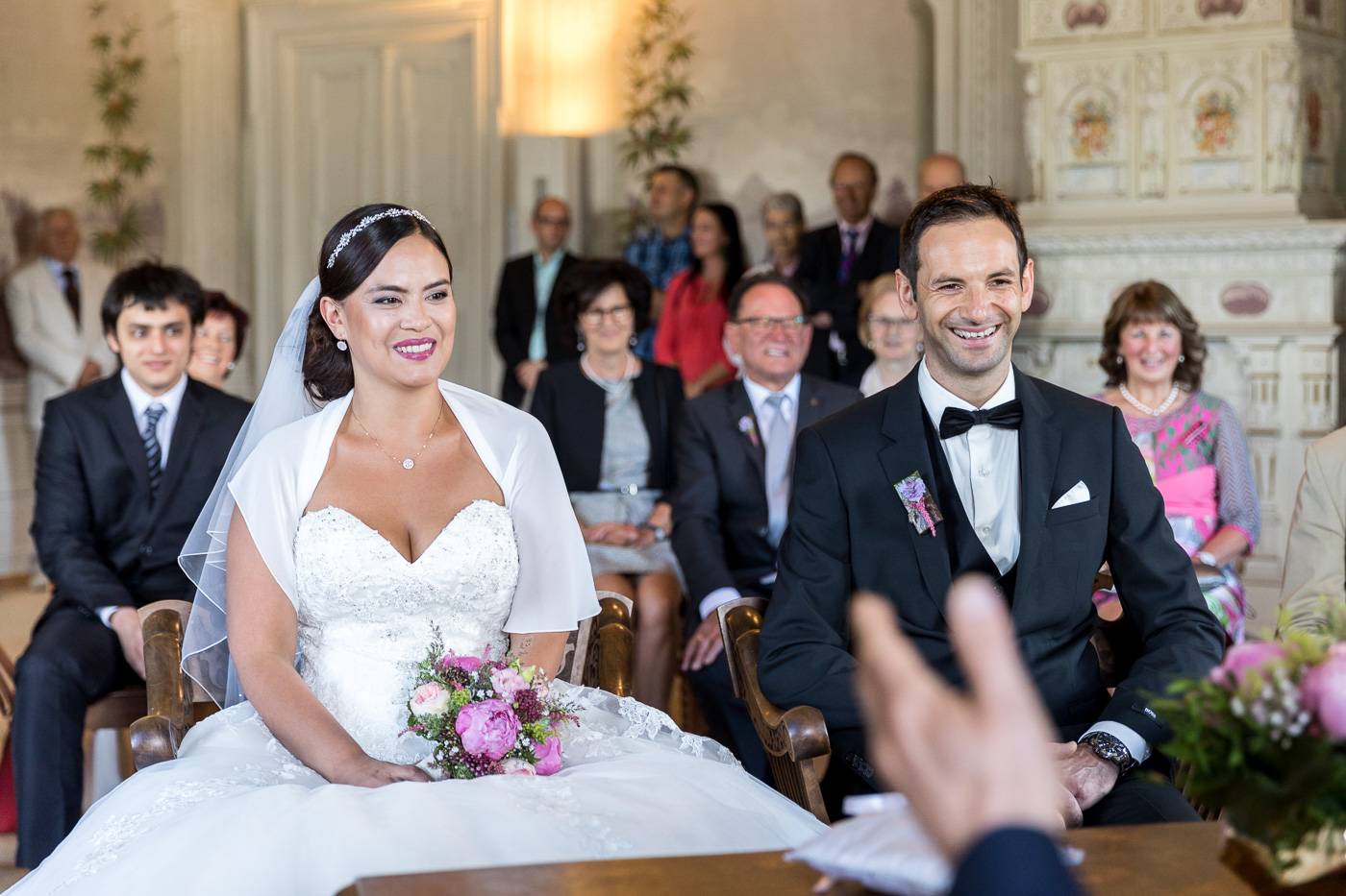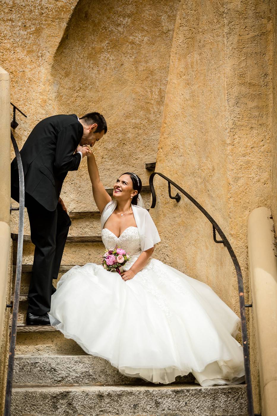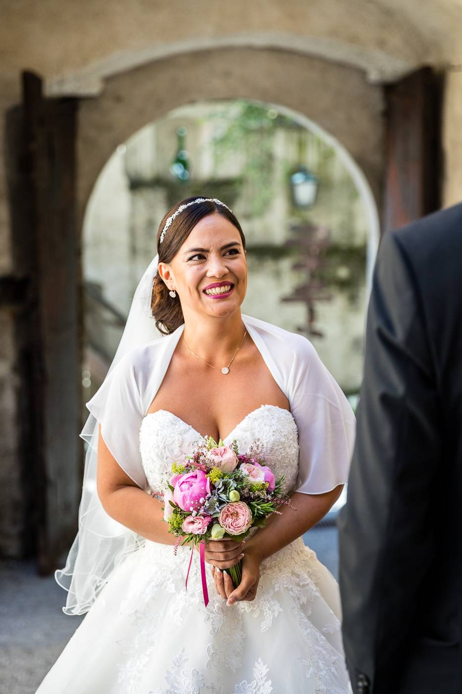 Barbaras und Jochens Hochzeit führte mich ins schöne Südtirol nach Bruneck. Beim gemeinsamen Locationcheck am Vorabend suchten wir nach fotogenen Plätzen rund ums Schloss Bruneck sowie in der Altstadt, war es doch meine erste Hochzeitsbegleitung an diesem schönen Fleckchen. Am Hochzeitstag traf die Braut mit einem 48 Jahre alten Fiat 600er zur Trauung ein, wo sie sich mit ihrem voluminösen und wunderschönen Kleid hineingepfercht hatte. Das erste Zusammentreffen des Brautpaares fand im Innenhof des Schloss Bruneck statt, wo sich die beiden unglaublich anstrahlten. Die standesamtliche Trauung fand in einem schönen Schlosszimmer statt und wurde von den Gästen mitzelebriert. Unter einem Schwall aus Seifenblasen betrat das frischverheiratete Pärchen danach den Burghof, wo bei Sekt und italienischen Köstlichkeiten zunächst mal angestossen und gefeiert wurde. Nach dem Sektempfang starteten wir die Portraitserie, wobei uns das Schloss, das auch das Messner Mountain Museum beherbergt, ein tolles Ambiente bot. Der kurze Regenguss bei den Portraits in der Altstadt danach konnte die Laune der beiden nicht trüben, so sehr genossen sie ihr Glück sich gefunden zu haben.