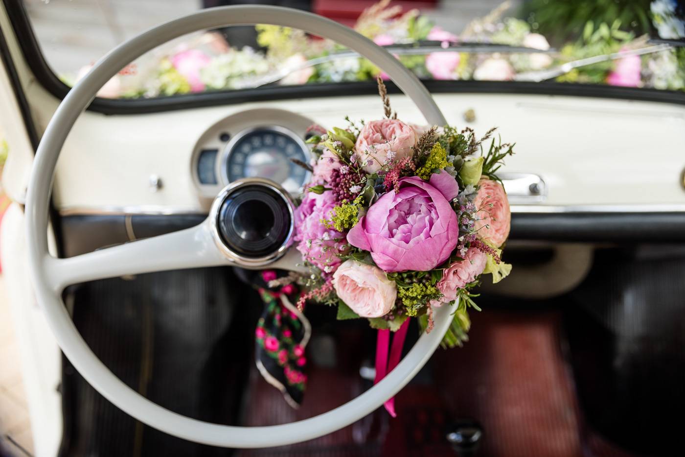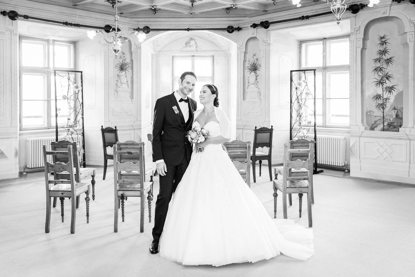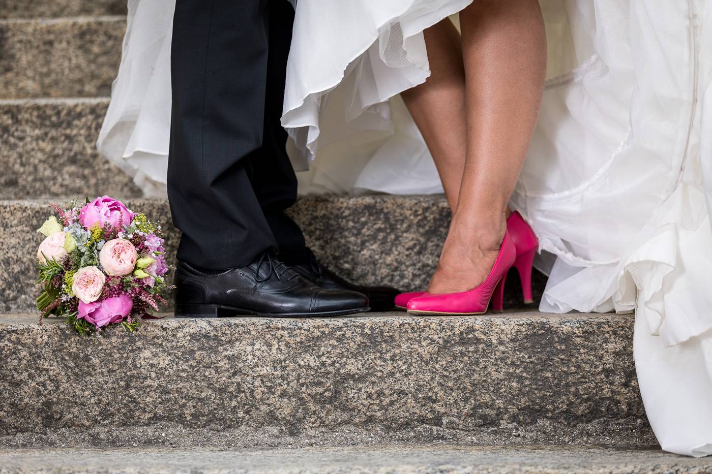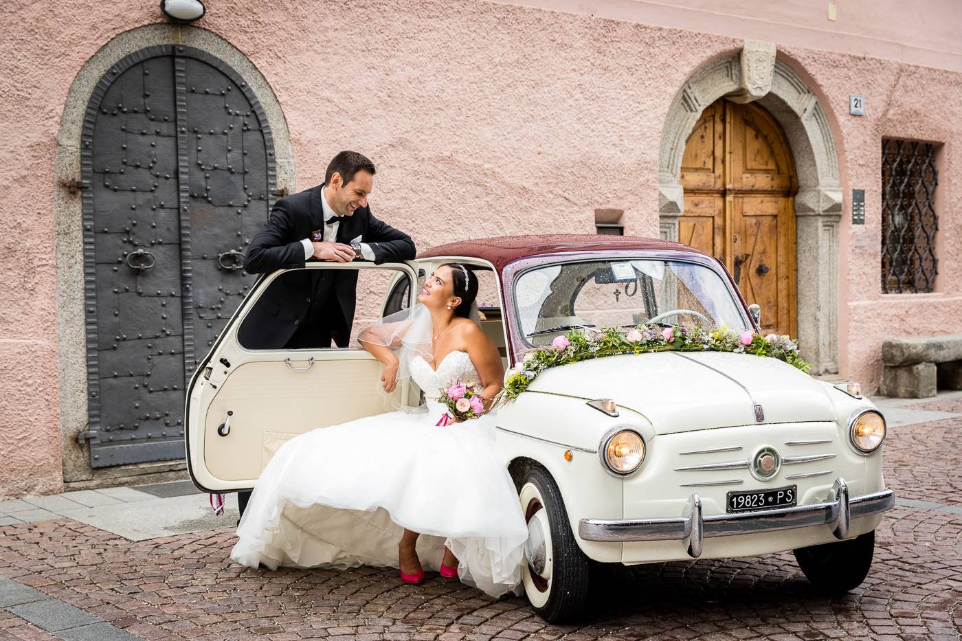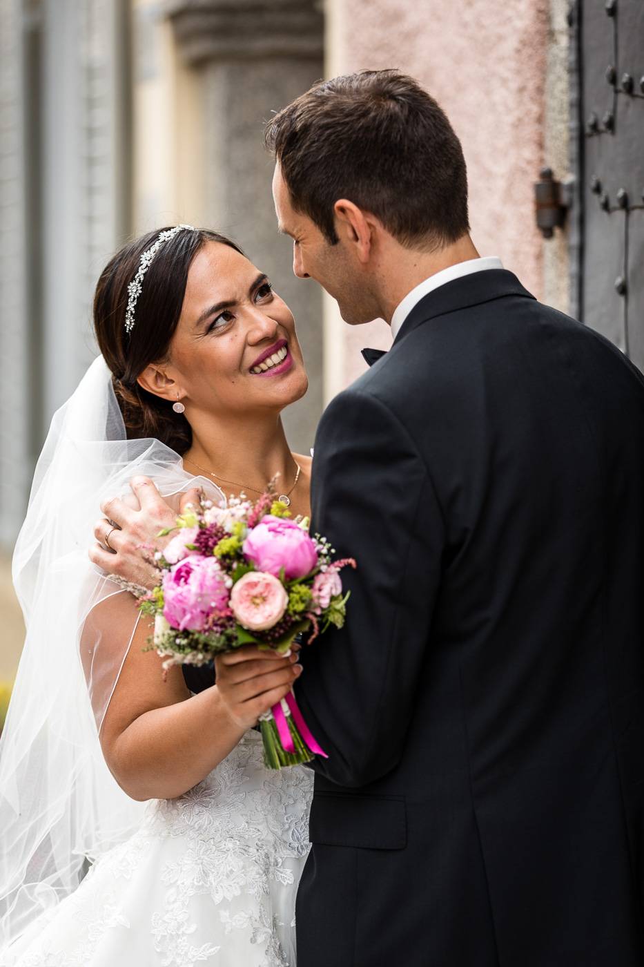 Barbaras und Jochens Hochzeit führte mich ins schöne Südtirol nach Bruneck. Beim gemeinsamen Locationcheck am Vorabend suchten wir nach fotogenen Plätzen rund ums Schloss Bruneck sowie in der Altstadt, war es doch meine erste Hochzeitsbegleitung an diesem schönen Fleckchen. Am Hochzeitstag traf die Braut mit einem 48 Jahre alten Fiat 600er zur Trauung ein, wo sie sich mit ihrem voluminösen und wunderschönen Kleid hineingepfercht hatte. Das erste Zusammentreffen des Brautpaares fand im Innenhof des Schloss Bruneck statt, wo sich die beiden unglaublich anstrahlten. Die standesamtliche Trauung fand in einem schönen Schlosszimmer statt und wurde von den Gästen mitzelebriert. Unter einem Schwall aus Seifenblasen betrat das frischverheiratete Pärchen danach den Burghof, wo bei Sekt und italienischen Köstlichkeiten zunächst mal angestossen und gefeiert wurde. Nach dem Sektempfang starteten wir die Portraitserie, wobei uns das Schloss, das auch das Messner Mountain Museum beherbergt, ein tolles Ambiente bot. Der kurze Regenguss bei den Portraits in der Altstadt danach konnte die Laune der beiden nicht trüben, so sehr genossen sie ihr Glück sich gefunden zu haben.