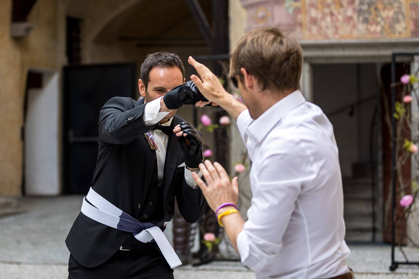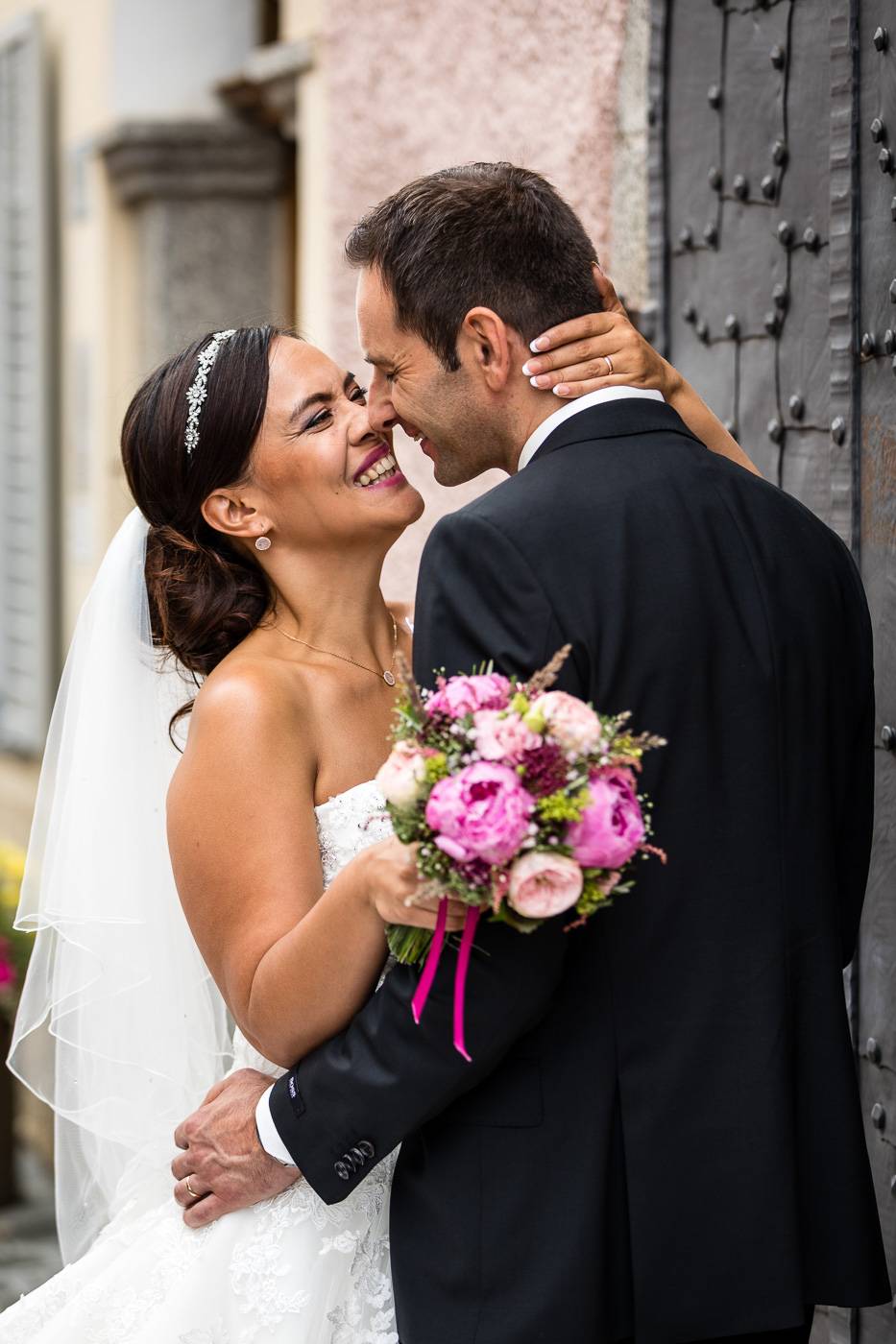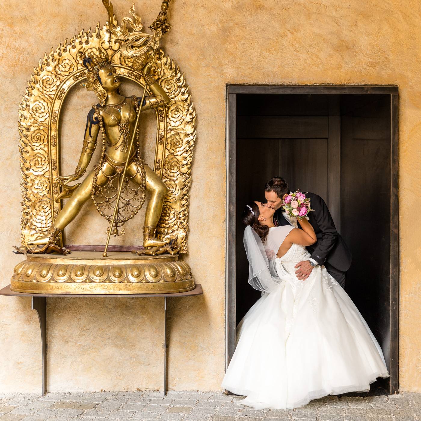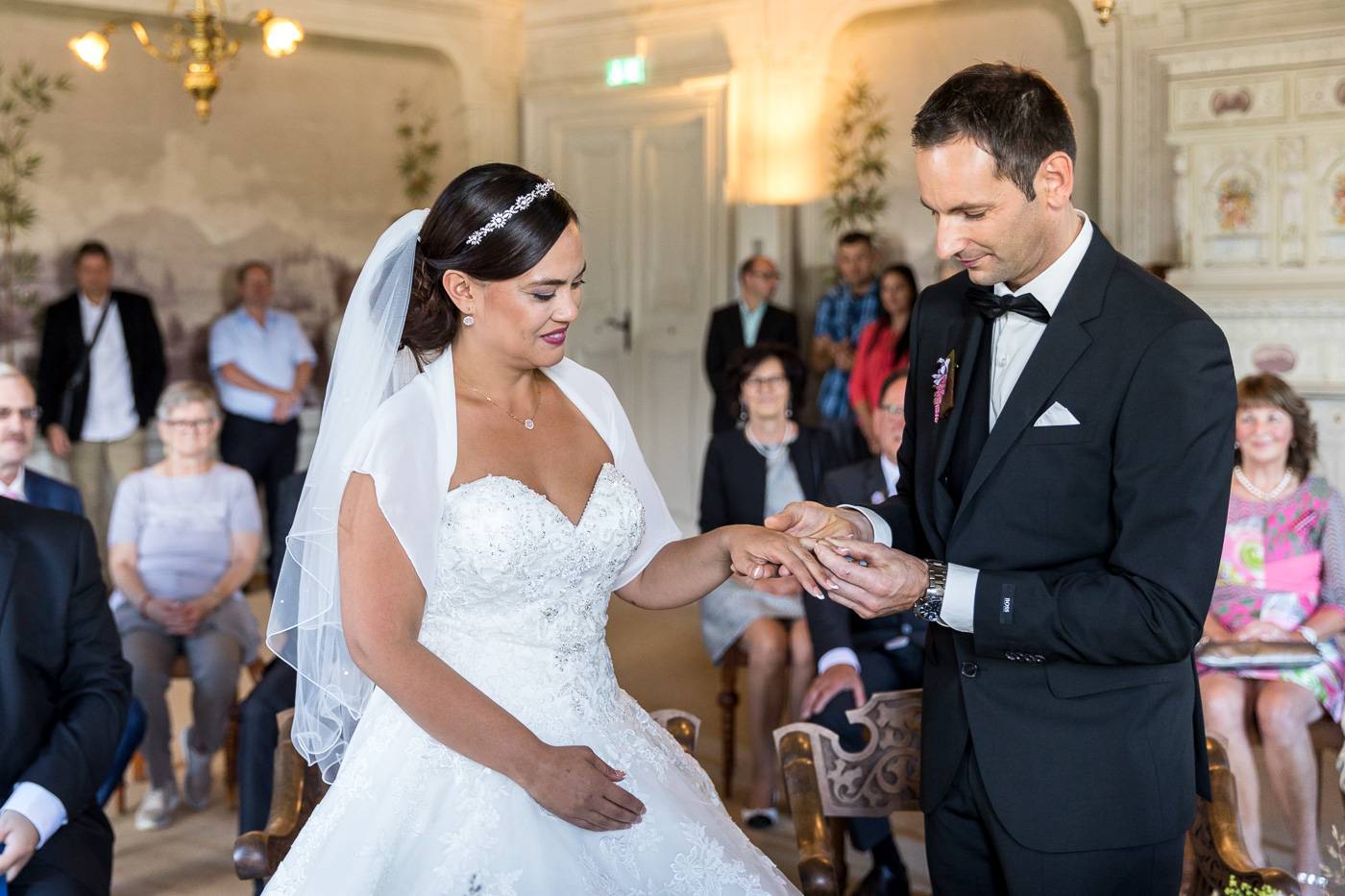 Barbaras und Jochens Hochzeit führte mich ins schöne Südtirol nach Bruneck. Beim gemeinsamen Locationcheck am Vorabend suchten wir nach fotogenen Plätzen rund ums Schloss Bruneck sowie in der Altstadt, war es doch meine erste Hochzeitsbegleitung an diesem schönen Fleckchen. Am Hochzeitstag traf die Braut mit einem 48 Jahre alten Fiat 600er zur Trauung ein, wo sie sich mit ihrem voluminösen und wunderschönen Kleid hineingepfercht hatte. Das erste Zusammentreffen des Brautpaares fand im Innenhof des Schloss Bruneck statt, wo sich die beiden unglaublich anstrahlten. Die standesamtliche Trauung fand in einem schönen Schlosszimmer statt und wurde von den Gästen mitzelebriert. Unter einem Schwall aus Seifenblasen betrat das frischverheiratete Pärchen danach den Burghof, wo bei Sekt und italienischen Köstlichkeiten zunächst mal angestossen und gefeiert wurde. Nach dem Sektempfang starteten wir die Portraitserie, wobei uns das Schloss, das auch das Messner Mountain Museum beherbergt, ein tolles Ambiente bot. Der kurze Regenguss bei den Portraits in der Altstadt danach konnte die Laune der beiden nicht trüben, so sehr genossen sie ihr Glück sich gefunden zu haben.