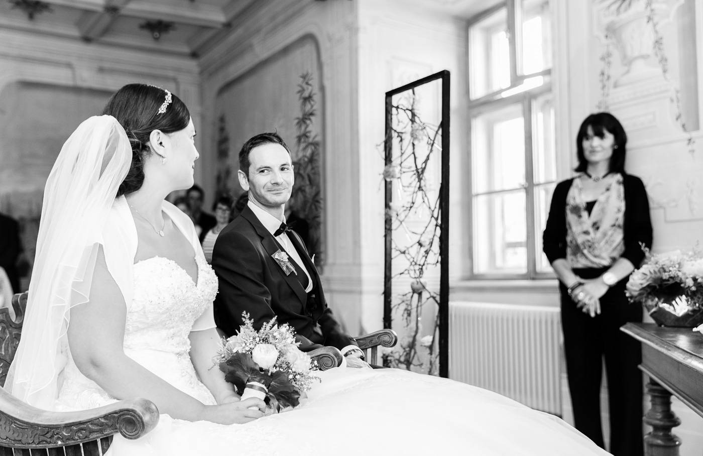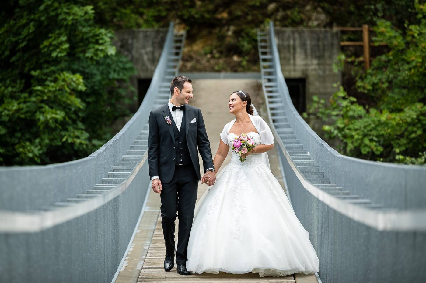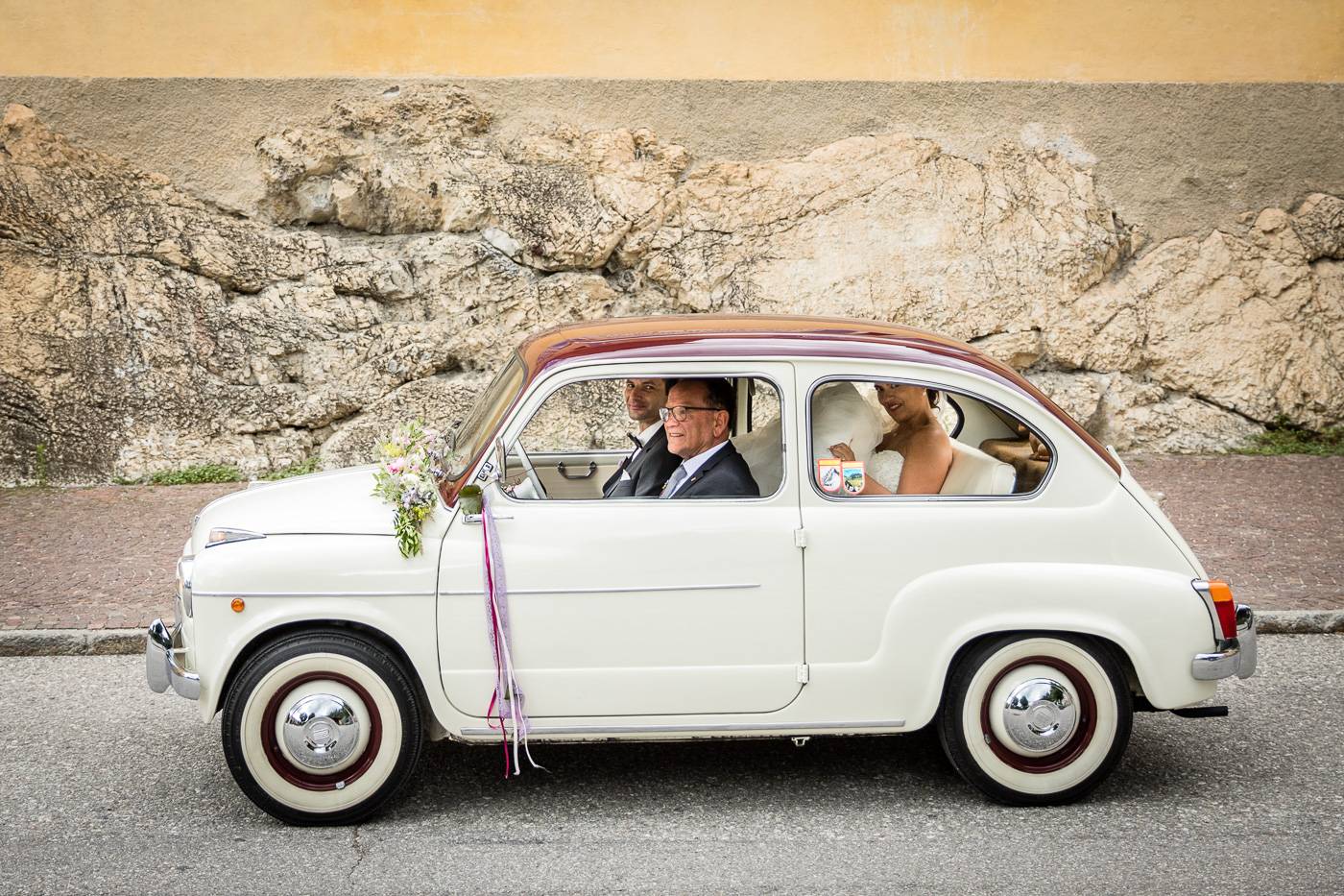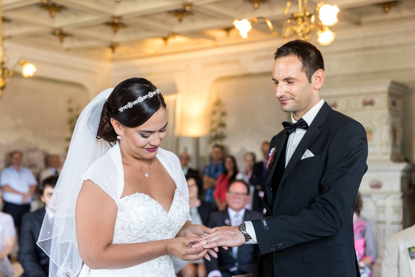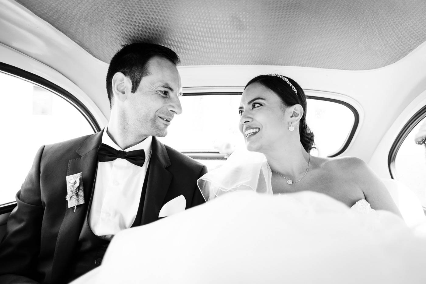 Barbaras und Jochens Hochzeit führte mich ins schöne Südtirol nach Bruneck. Beim gemeinsamen Locationcheck am Vorabend suchten wir nach fotogenen Plätzen rund ums Schloss Bruneck sowie in der Altstadt, war es doch meine erste Hochzeitsbegleitung an diesem schönen Fleckchen. Am Hochzeitstag traf die Braut mit einem 48 Jahre alten Fiat 600er zur Trauung ein, wo sie sich mit ihrem voluminösen und wunderschönen Kleid hineingepfercht hatte. Das erste Zusammentreffen des Brautpaares fand im Innenhof des Schloss Bruneck statt, wo sich die beiden unglaublich anstrahlten. Die standesamtliche Trauung fand in einem schönen Schlosszimmer statt und wurde von den Gästen mitzelebriert. Unter einem Schwall aus Seifenblasen betrat das frischverheiratete Pärchen danach den Burghof, wo bei Sekt und italienischen Köstlichkeiten zunächst mal angestossen und gefeiert wurde. Nach dem Sektempfang starteten wir die Portraitserie, wobei uns das Schloss, das auch das Messner Mountain Museum beherbergt, ein tolles Ambiente bot. Der kurze Regenguss bei den Portraits in der Altstadt danach konnte die Laune der beiden nicht trüben, so sehr genossen sie ihr Glück sich gefunden zu haben.