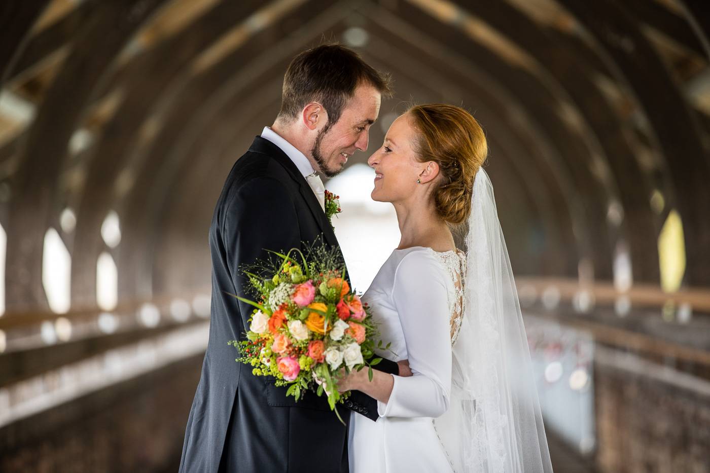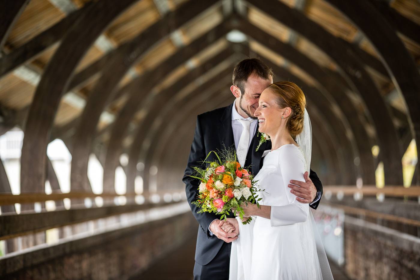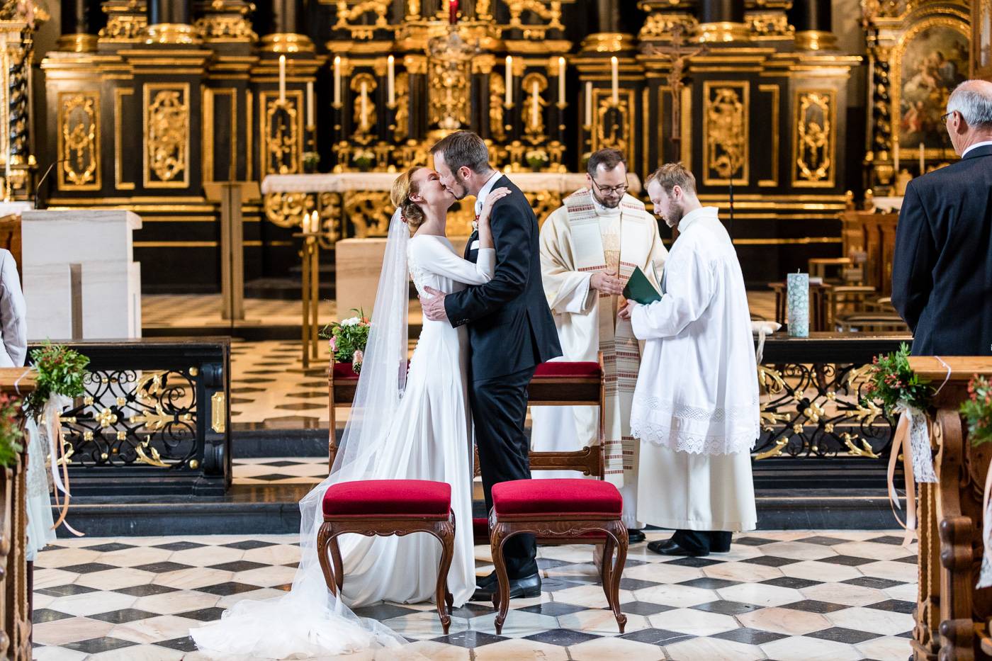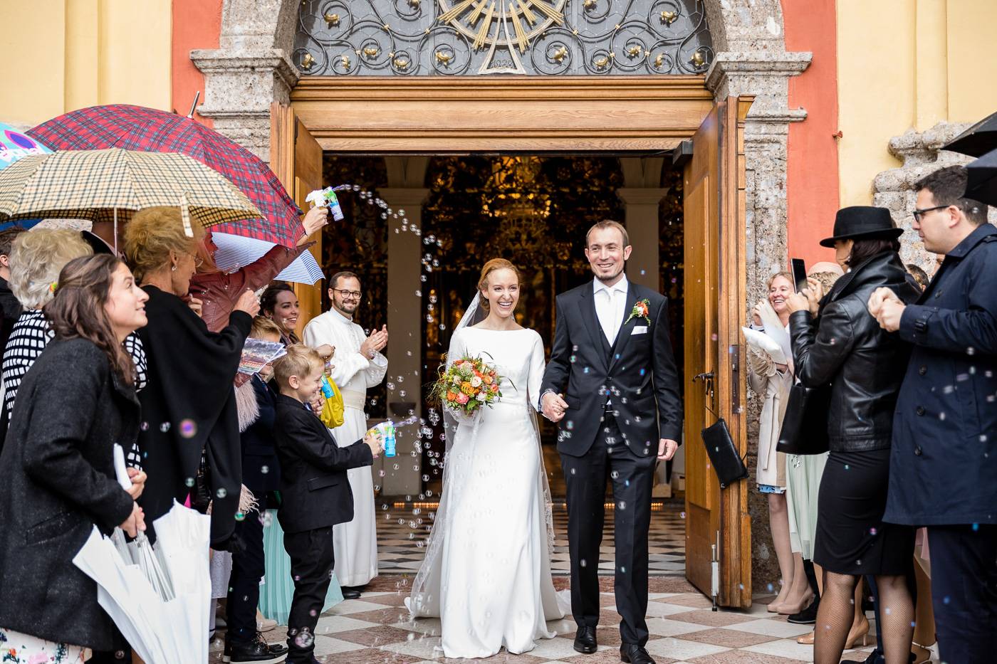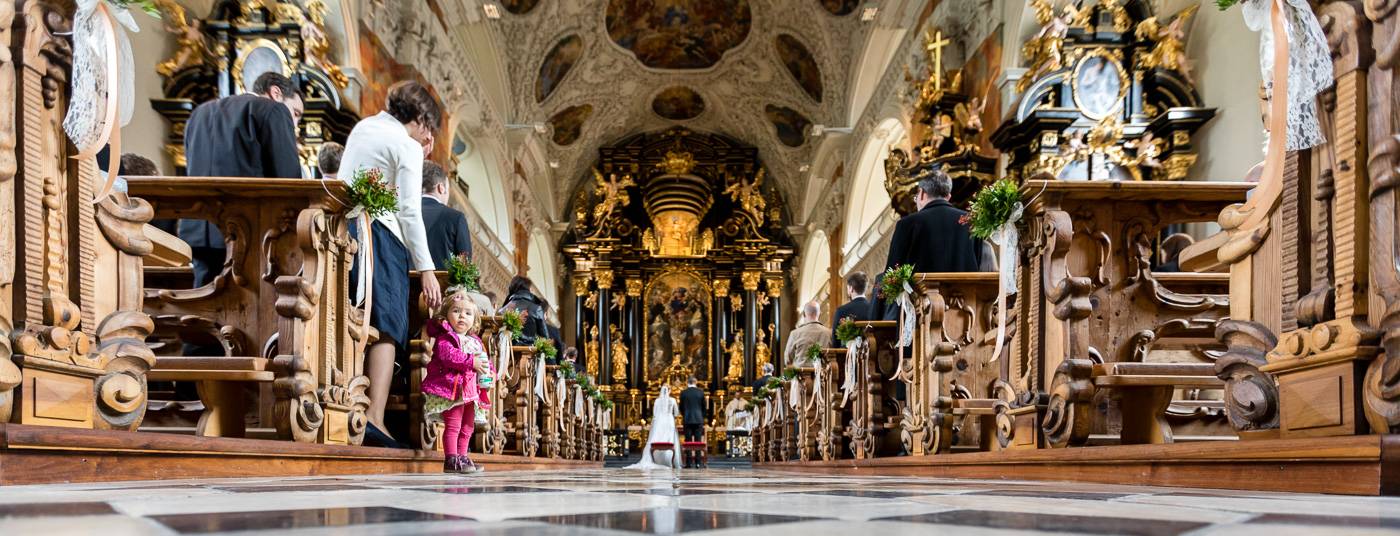 Beim Infogespräch in meinem Studio erzählten mir Johanna und Christoph von ihrem ersten Zusammentreffen. Die beiden lernten sich dort kennen, wo sie als damalige Medizinstudenten sehr viel Zeit verbrachten: im alten Lesesaal der Universität Innsbruck. Am Hochzeitstag durften wir diesen besonderen Ort nutzen, um die Kennenlerngeschichte der beiden zu erzählen. In Verbindung mit der interessanten Architektur und besonderer Lichtsetzung konnte ich mein Brautpaar optimal in Szene setzen. Diese Indoor-Location rettete uns ausserdem vor dem nassen und kalten Wetter draussen. Der einzige Regen, der auf die beiden beim Portraitshooting herunterprasselte, war ein Regen aus Blütenblätter 😉 Eine kurze Wetterbesserung erlaubte es uns dann doch, ein paar Fotos im Freien zu machen. Die stimmungsvolle Trauungszeremonie fand anschließend in der wunderschönen Stiftskirche Wilten statt. Die Blicke, die sich das Brautpaar zuwarf und ein paar Freudenstränchen verrieten ihre starke Verbundenheit und die große Freude über diesen besonderen Tag. Unter einem Mix aus Seifenblasen und ein paar Regentropfen verliess das frisch vermählte Paar freudestrahlend die Kirche. Die abendliche Hochzeitsfeier fand beim Isserwirt in Lans statt, wo Freunde und Verwandte einige sehr nette und lustige Überraschungen für Johanna und Christoph bereit hielten.