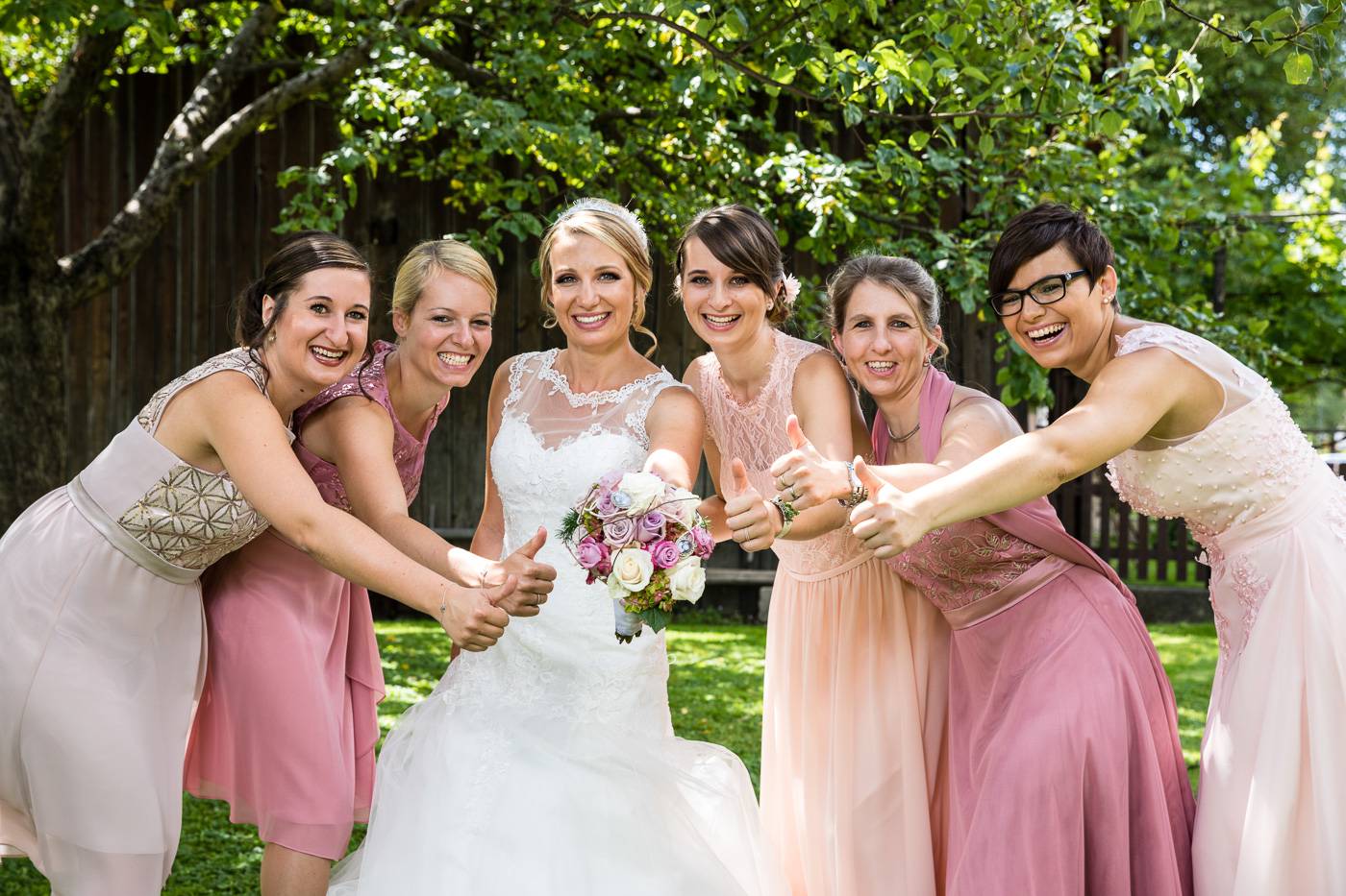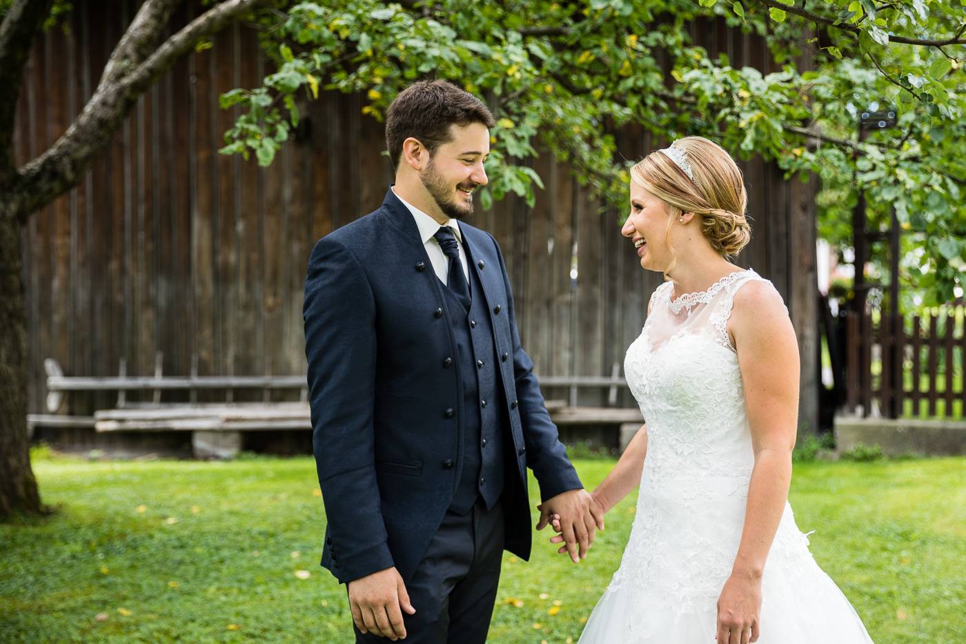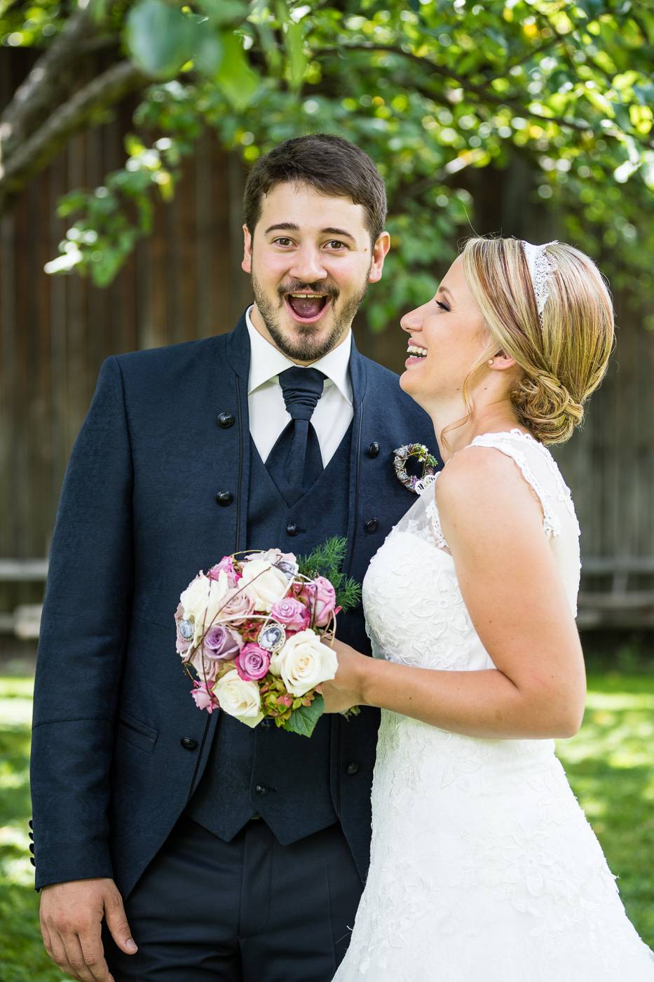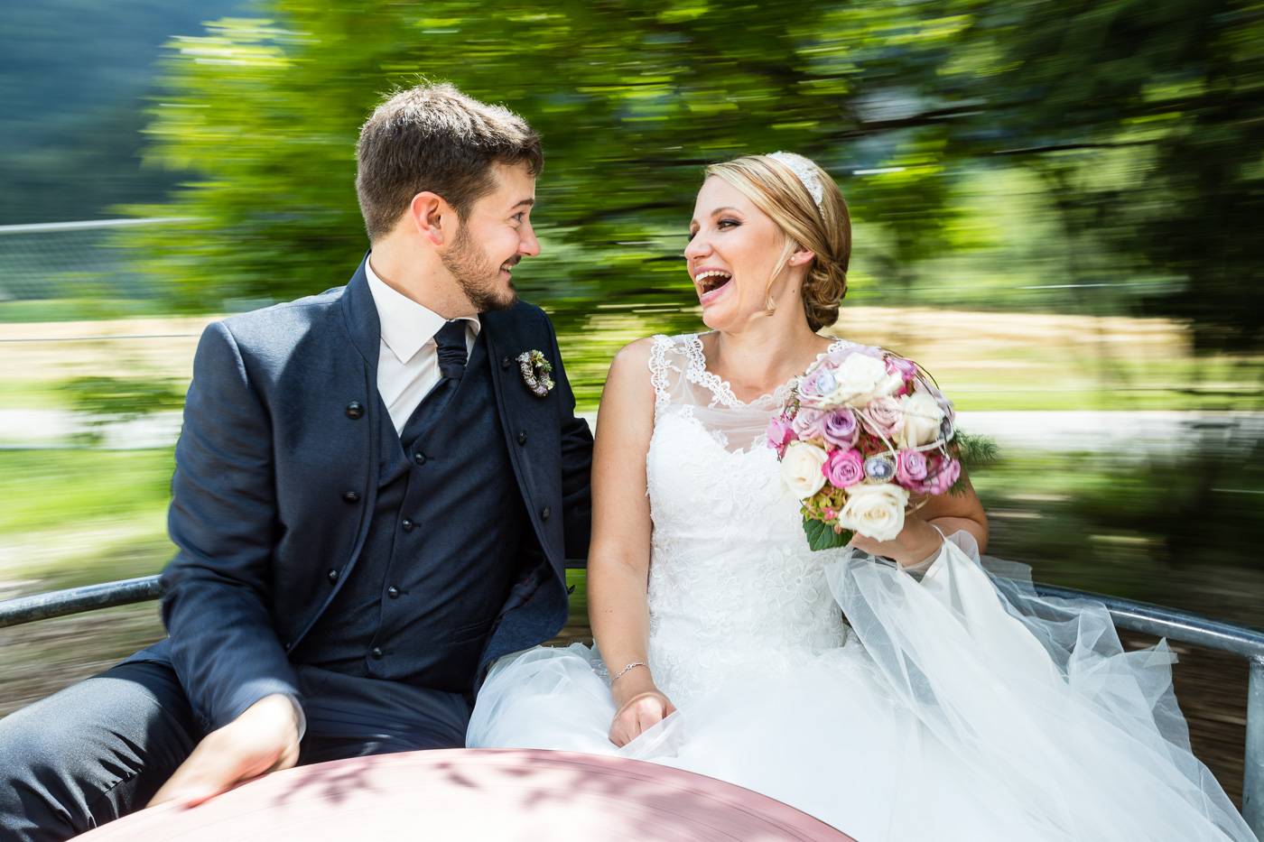 Bei einem längeren USA-Aufenthalt vor etlichen Jahren traf Bianca ihren Zach und es war sehr schnell klar, dass die beiden wie füreinander geschaffen waren. Nach Zachs „großen Sprung über den Teich“ feierten sie letzten Juli ihre wunderbare Hochzeit, natürlich zusammen mit vielen internationalen Gästen. Am Hochzeitstag selbst durfte ich die beiden Turteltäubchen vom Anziehen weg fotografisch begleiten. Das erste Mal an diesem Tag fielen sie sich in ihrem Garten um den Hals, als sie sich das erste Mal im Hochzeitsoutfit sahen. Danach hielt das Brautpaar eine Überraschung für ihre jeweils fünf Brautjungfern und „groomsmen“ parat. Dass bei der anschließenden Portraitserie der Spaßfaktor nicht fehlen durfte, war mir sofort klar, als ich die beiden im Vorfeld kennenlernte. Wir trotzen den wirklich heißen Juli-Temperaturen und liessen uns im Ringelspiel den Fahrtwind um die Ohren blasen 😉 Als Biancas Stöckelschuh zufälligerweise im Holzboden stecken blieb und Zach ihn befreite, traute er seinen Augen nicht. Sein absoluter Lieblingsspruch aus Harry Potter klebte auf Biancas Schuhsohlen. Die Freude und Lachsalve die dieser Entdeckung folgten, war unübersehbar. In der Kirche von Urgen bei Fließ fand am Nachmittag die freie Trauung statt, die von der Hochzeitsrednerin Susan sehr schön und emotional gestaltet wurde. Unter einem Schwall aus Seifenblasen verliess das frischvermählte und überglückliche Brautpaar die Kirche um die vielen Glückwünsche ihrer Gäste entgegen zu nehmen. Mit einem alten VW Käfer Cabrio wurden Bianca und Zach dann nach Schönwies chauffiert, wo eine nasse Überraschung von der Feuerwehr Schönwies auf sie wartete. Bei der Trofana Tyrol in Mils empfing sie danach die Musikkapelle Mils, wo sie nacheinander den Takt angeben durften. Die abendliche Feier eröffnete der „Best man“ Paul mit einer schönen, persönlichen Rede. Danach folgte eine ausgelassene Feier mit vielen gelungenen Einlagen und toller Partystimmung. Der Anschnitt der Hochzeitstorte bildete spätabends den Abschluss meiner fotografischen Begleitung während die Hochzeitsgesellschaft diesen besonderen Freudetag von Bianca und Zach noch stimmungsgeladen ausklingen liess.