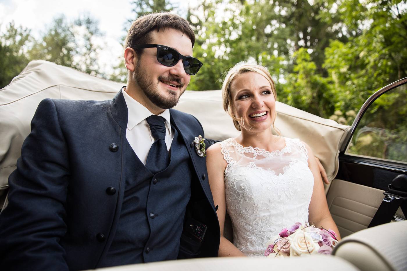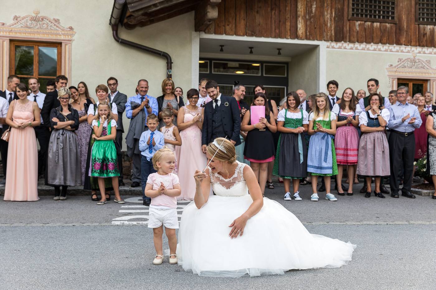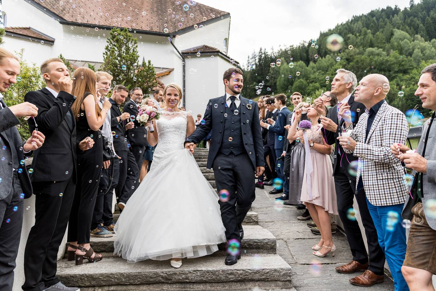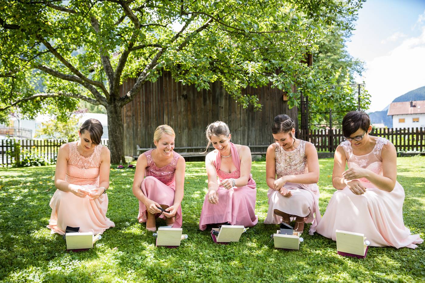 Bei einem längeren USA-Aufenthalt vor etlichen Jahren traf Bianca ihren Zach und es war sehr schnell klar, dass die beiden wie füreinander geschaffen waren. Nach Zachs „großen Sprung über den Teich“ feierten sie letzten Juli ihre wunderbare Hochzeit, natürlich zusammen mit vielen internationalen Gästen. Am Hochzeitstag selbst durfte ich die beiden Turteltäubchen vom Anziehen weg fotografisch begleiten. Das erste Mal an diesem Tag fielen sie sich in ihrem Garten um den Hals, als sie sich das erste Mal im Hochzeitsoutfit sahen. Danach hielt das Brautpaar eine Überraschung für ihre jeweils fünf Brautjungfern und „groomsmen“ parat. Dass bei der anschließenden Portraitserie der Spaßfaktor nicht fehlen durfte, war mir sofort klar, als ich die beiden im Vorfeld kennenlernte. Wir trotzen den wirklich heißen Juli-Temperaturen und liessen uns im Ringelspiel den Fahrtwind um die Ohren blasen 😉 Als Biancas Stöckelschuh zufälligerweise im Holzboden stecken blieb und Zach ihn befreite, traute er seinen Augen nicht. Sein absoluter Lieblingsspruch aus Harry Potter klebte auf Biancas Schuhsohlen. Die Freude und Lachsalve die dieser Entdeckung folgten, war unübersehbar. In der Kirche von Urgen bei Fließ fand am Nachmittag die freie Trauung statt, die von der Hochzeitsrednerin Susan sehr schön und emotional gestaltet wurde. Unter einem Schwall aus Seifenblasen verliess das frischvermählte und überglückliche Brautpaar die Kirche um die vielen Glückwünsche ihrer Gäste entgegen zu nehmen. Mit einem alten VW Käfer Cabrio wurden Bianca und Zach dann nach Schönwies chauffiert, wo eine nasse Überraschung von der Feuerwehr Schönwies auf sie wartete. Bei der Trofana Tyrol in Mils empfing sie danach die Musikkapelle Mils, wo sie nacheinander den Takt angeben durften. Die abendliche Feier eröffnete der „Best man“ Paul mit einer schönen, persönlichen Rede. Danach folgte eine ausgelassene Feier mit vielen gelungenen Einlagen und toller Partystimmung. Der Anschnitt der Hochzeitstorte bildete spätabends den Abschluss meiner fotografischen Begleitung während die Hochzeitsgesellschaft diesen besonderen Freudetag von Bianca und Zach noch stimmungsgeladen ausklingen liess.