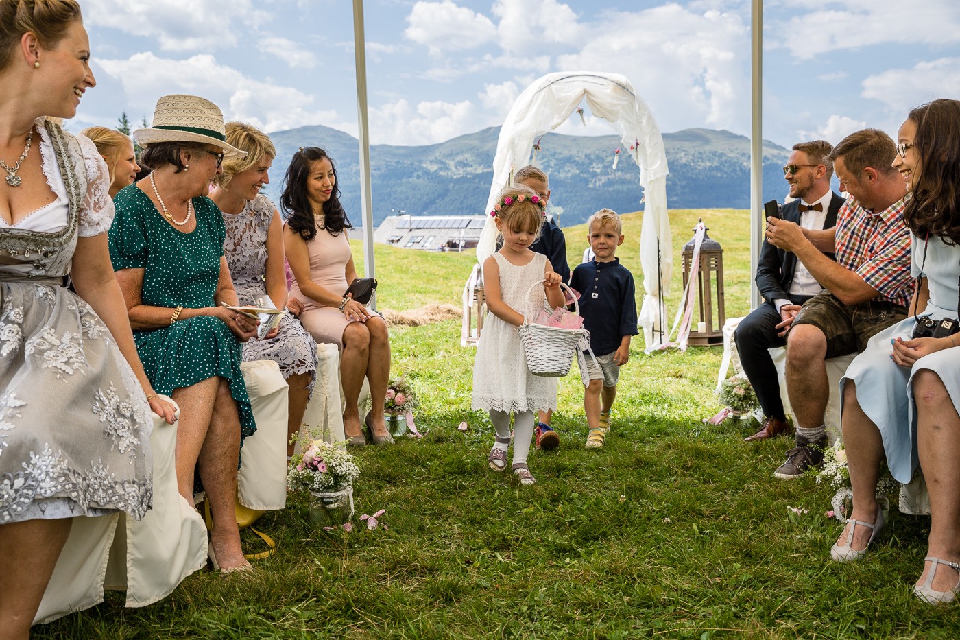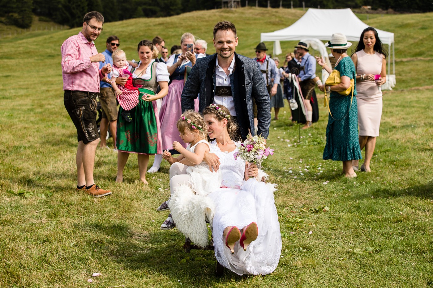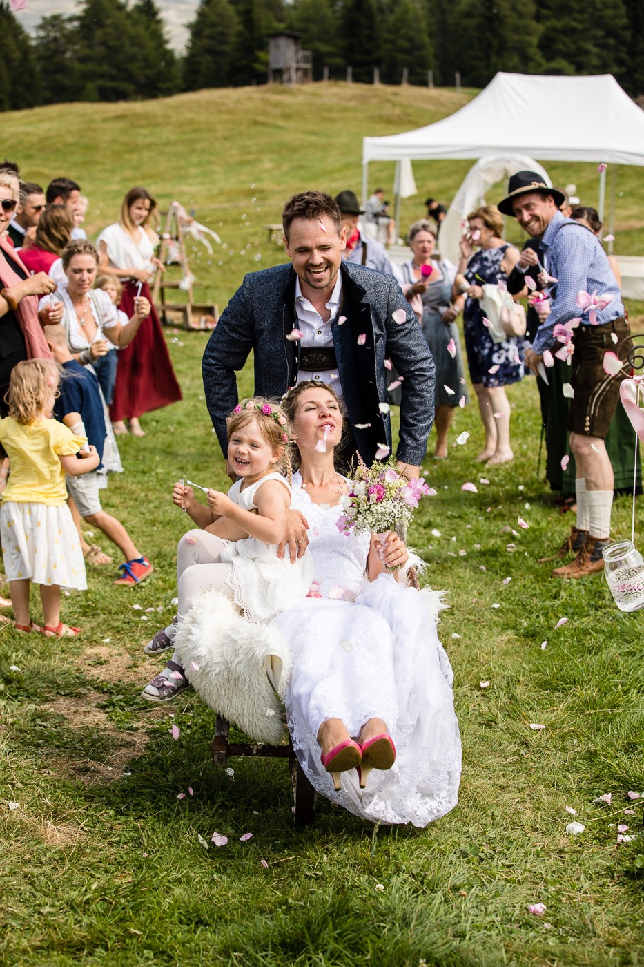 Anja und Markus hatten für ihren Hochzeitstag einen ganz besonderen Ort in Tirol ausgewählt: die idyllisch gelegene Sattelbergalm im Wipptal auf 1600hm. Vor Beginn der Trauung und dem Eintreffen der Gäste traf ich das symphatische Brautpaar und ihre süße Tochter Nora um ein paar Portraitfotos in dieser herrlichen Kulisse zu schießen. Die freie Trauungszeremonie wurde mit dem Einzug der Blumenkinder und Braut Anja mit ihrem Vater über einen Wiesenweg zum Ort der Trauung eröffnet, wo Markus schon ganz sehnsüchtig wartete. Anja hatte kurz davor ihr Dirndl gegen ein weißes Brautkleid eingetauscht. Die freie Trauung wurde von der Hochzeitsrednerin Birgit Bruckmüller gestaltet und fand mitten in der Almwiese vor der Bergkulisse der Stubaier Alpen statt. Schöner ging´s nicht. Ein Herz aus Heu säumte diesen besonderen Trauungsort, wo sich die beiden ihr Ja-Wort gaben. Auch ihre Tochter wurde feierlich in die Zeremonie eingebunden. Die sehr persönliche Trauungsrede von Birgit führte immer wieder zu Lachern und auch zu ein paar Freudentränchen. Zum Auszug durften zur großen Überraschung (keiner der beiden wußte Bescheid) Anja und Nora in einer Schubkarre Platz nehmen. Markus chauffierte sie durch einen Spalier von jubelnden Gäste bis zur Hütte. Das war sicherlich der witzigste Auszug, den ich bisher fotografieren durfte.