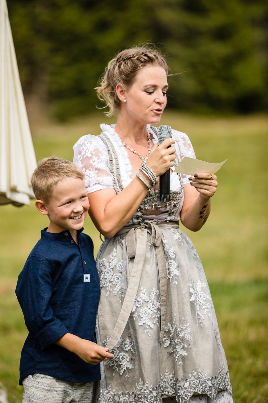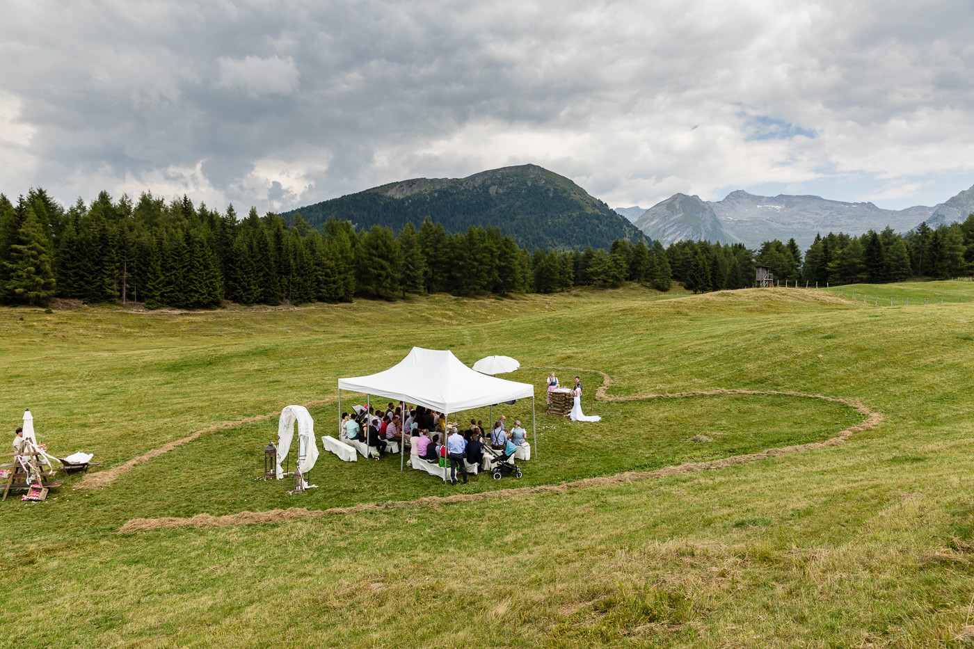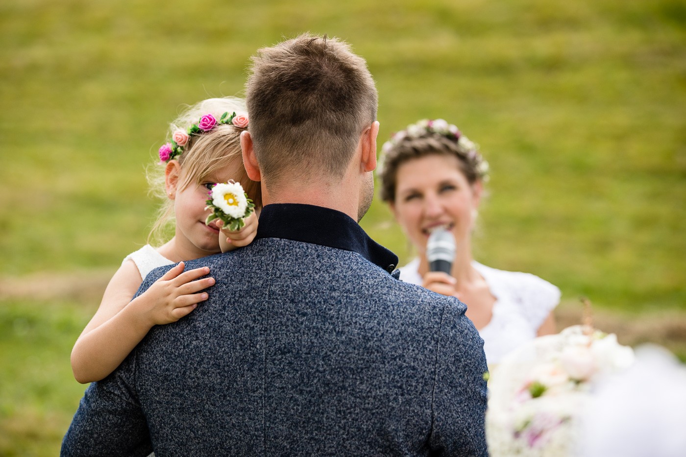 Anja und Markus hatten für ihren Hochzeitstag einen ganz besonderen Ort in Tirol ausgewählt: die idyllisch gelegene Sattelbergalm im Wipptal auf 1600hm. Vor Beginn der Trauung und dem Eintreffen der Gäste traf ich das symphatische Brautpaar und ihre süße Tochter Nora um ein paar Portraitfotos in dieser herrlichen Kulisse zu schießen. Die freie Trauungszeremonie wurde mit dem Einzug der Blumenkinder und Braut Anja mit ihrem Vater über einen Wiesenweg zum Ort der Trauung eröffnet, wo Markus schon ganz sehnsüchtig wartete. Anja hatte kurz davor ihr Dirndl gegen ein weißes Brautkleid eingetauscht. Die freie Trauung wurde von der Hochzeitsrednerin Birgit Bruckmüller gestaltet und fand mitten in der Almwiese vor der Bergkulisse der Stubaier Alpen statt. Schöner ging´s nicht. Ein Herz aus Heu säumte diesen besonderen Trauungsort, wo sich die beiden ihr Ja-Wort gaben. Auch ihre Tochter wurde feierlich in die Zeremonie eingebunden. Die sehr persönliche Trauungsrede von Birgit führte immer wieder zu Lachern und auch zu ein paar Freudentränchen. Zum Auszug durften zur großen Überraschung (keiner der beiden wußte Bescheid) Anja und Nora in einer Schubkarre Platz nehmen. Markus chauffierte sie durch einen Spalier von jubelnden Gäste bis zur Hütte. Das war sicherlich der witzigste Auszug, den ich bisher fotografieren durfte.